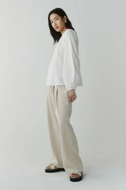 The Marle Everly Top in Rice is built upon the adored Oliver Top. It is a long-sleeve top, and this version is crafted in crisp textured cotton. It features a round neckline at the front and a deep V-neckline at the back, secured by a cotton tie at the top of the shoulder. The long sleeves feature a balloon silhouette, and the body has a subtle A-line shape.