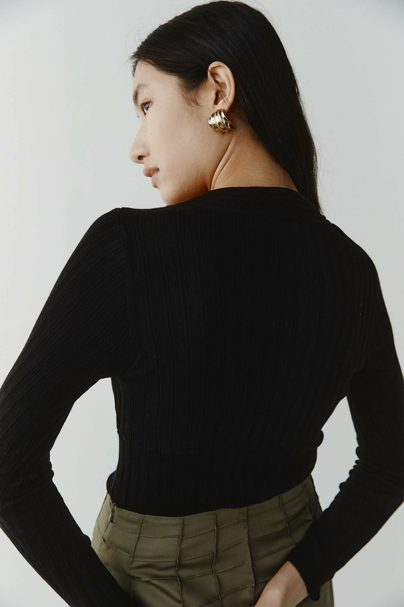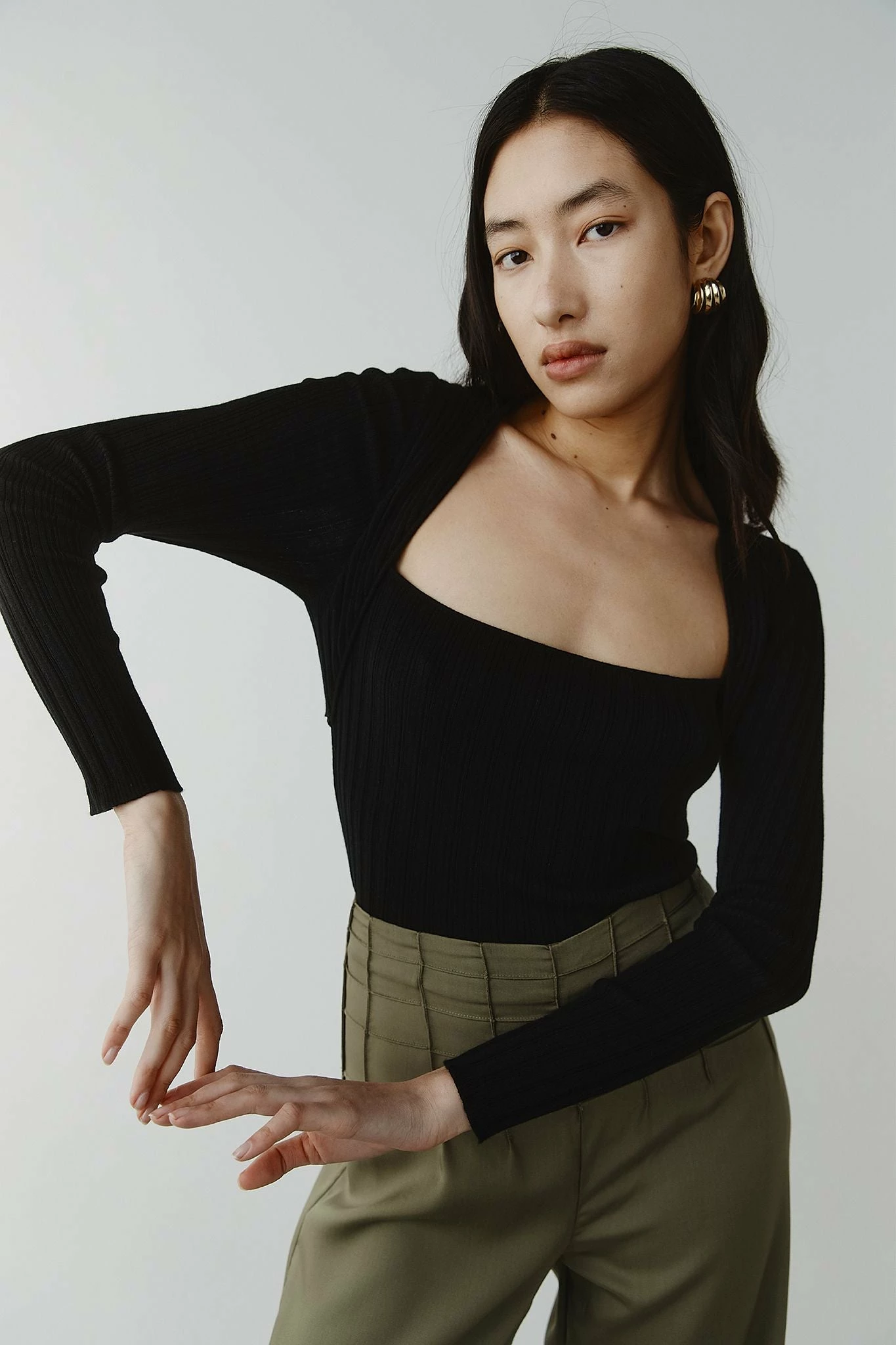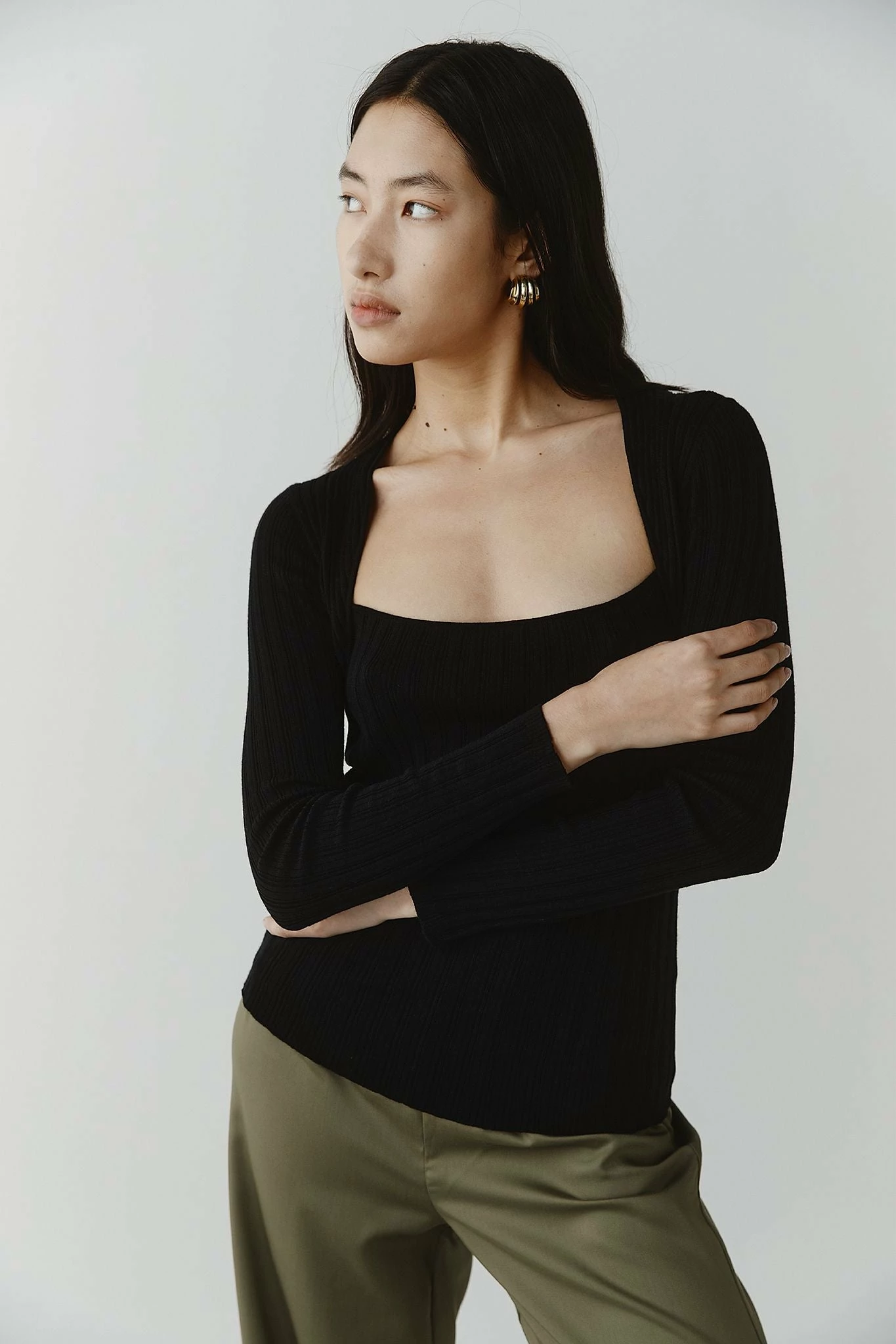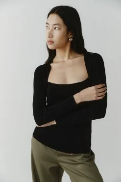 The Marle Leon Top in Black is a lightweight ribbed knit crafted in their signature cotton/merino yarn. It features a fitted silhouette with long sleeves and a feminine square neckline. The top features two layers where the sleeves are stitched on as a separate piece giving a subtle layering effect. Pair it with a silk skirt or tailored pants for an elevated look.