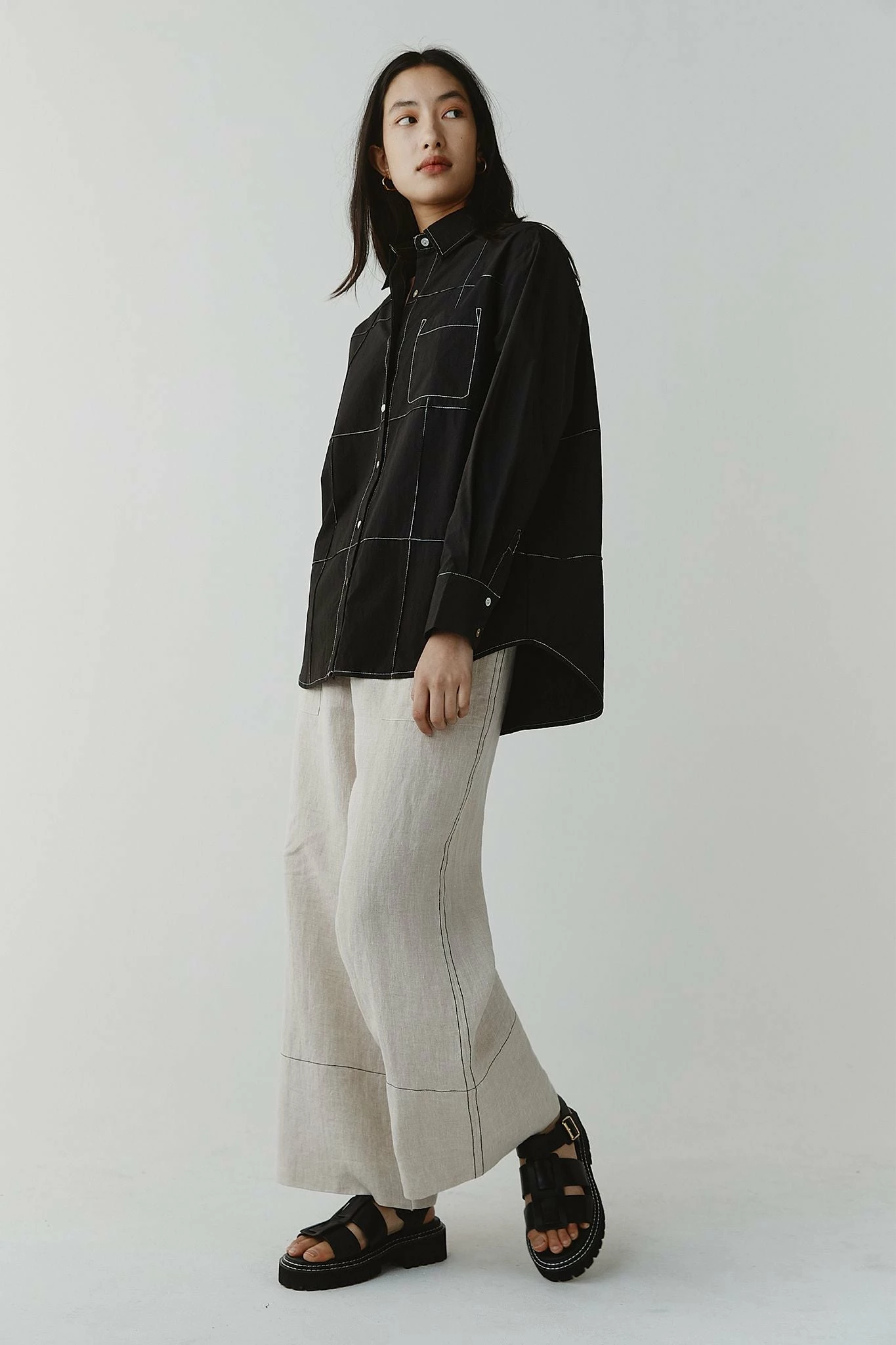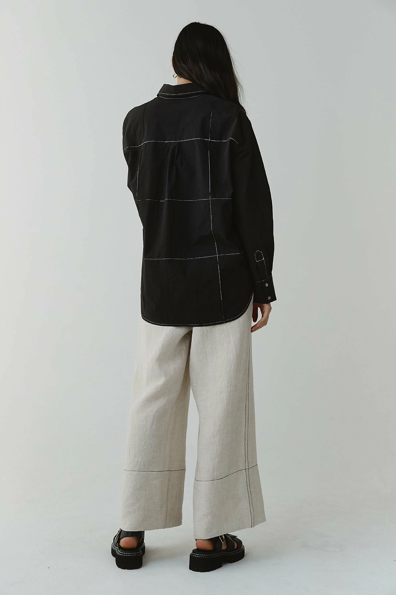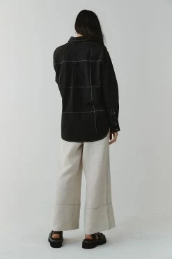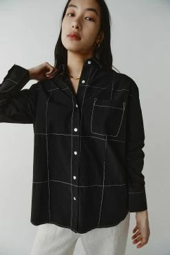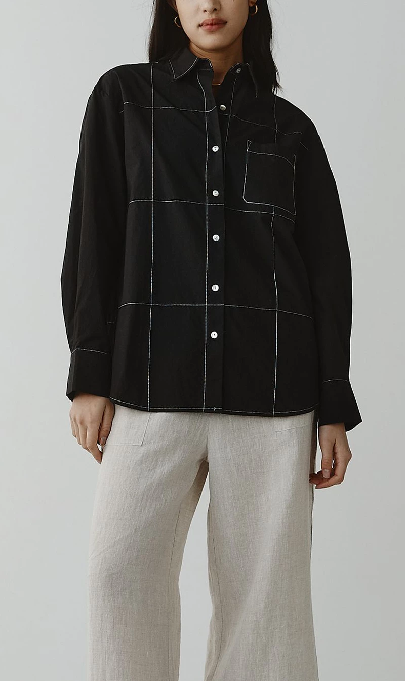 The Marle Pierre Shirt in Black is a perfect everyday essential. Featuring a classic shirt silhouette with a standard collar, and long sleeves finished with a single shell button at the cuff. Crafted with a curved hemline that falls slightly longer at the back, secured with shell buttons done the centre front and a single pocket at the chest. All tied together with contrast grid stitch detailing.