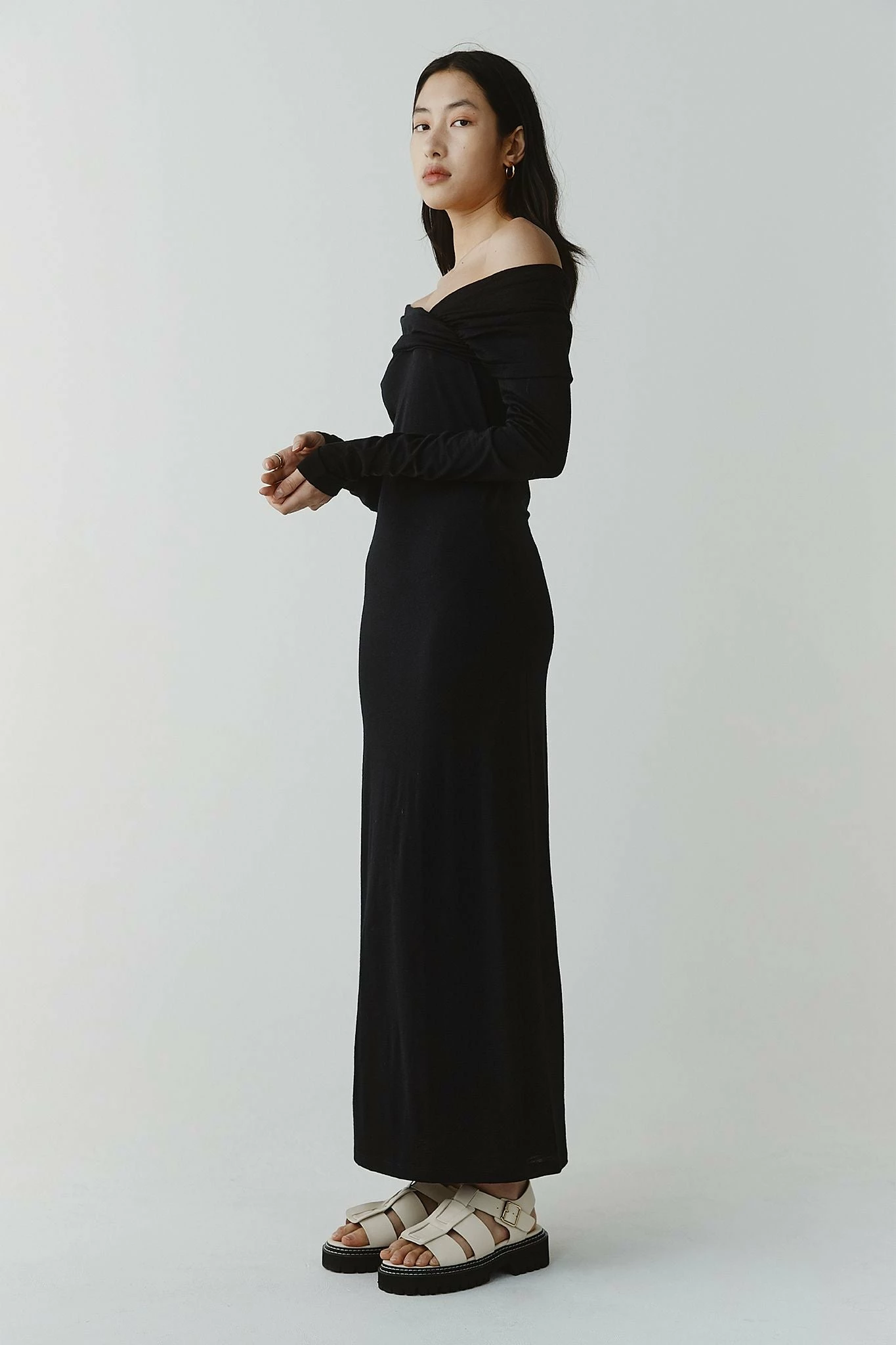 The Marle Riley Dress in Black is designed from the fan favourite, Zellie Top from past seasons. This dress is finely knitted in 100% merino. It has a slim, straight silhouette through the body and long sleeves. The top of this dress features a cross-over detail that wraps around the body and falls off the shoulder creating a feminine silhouette.