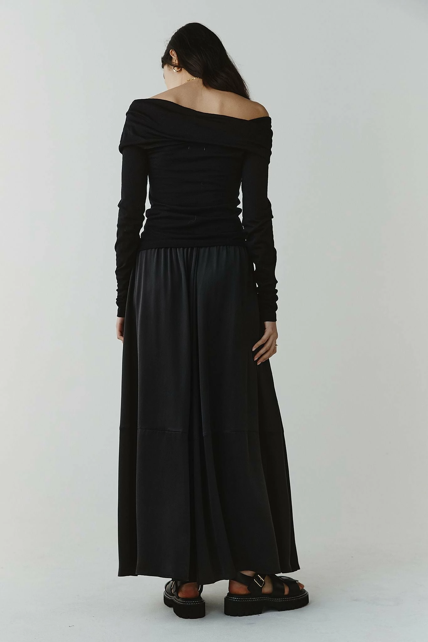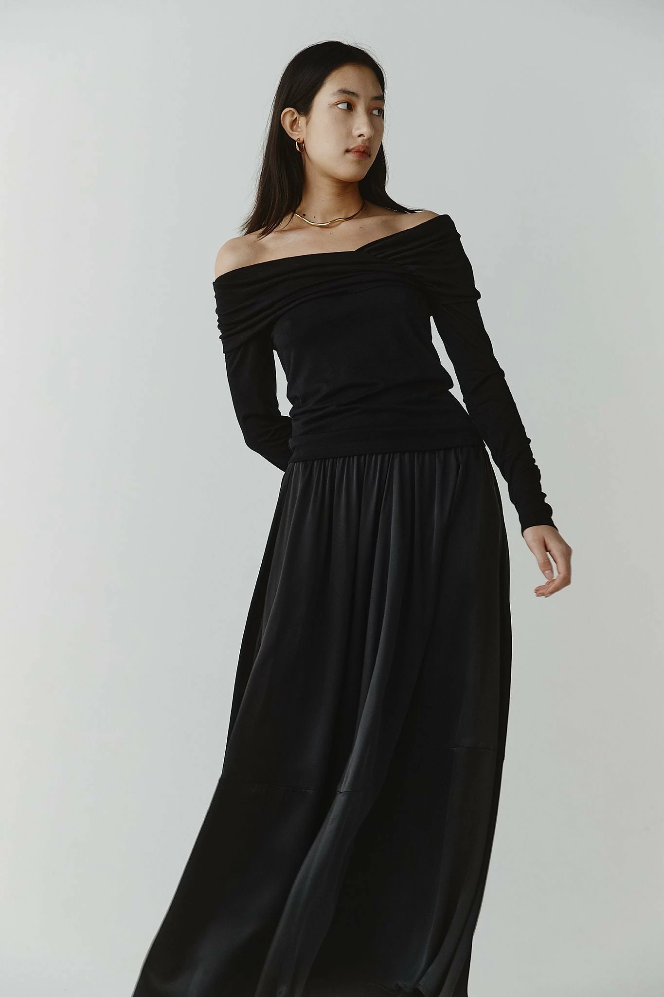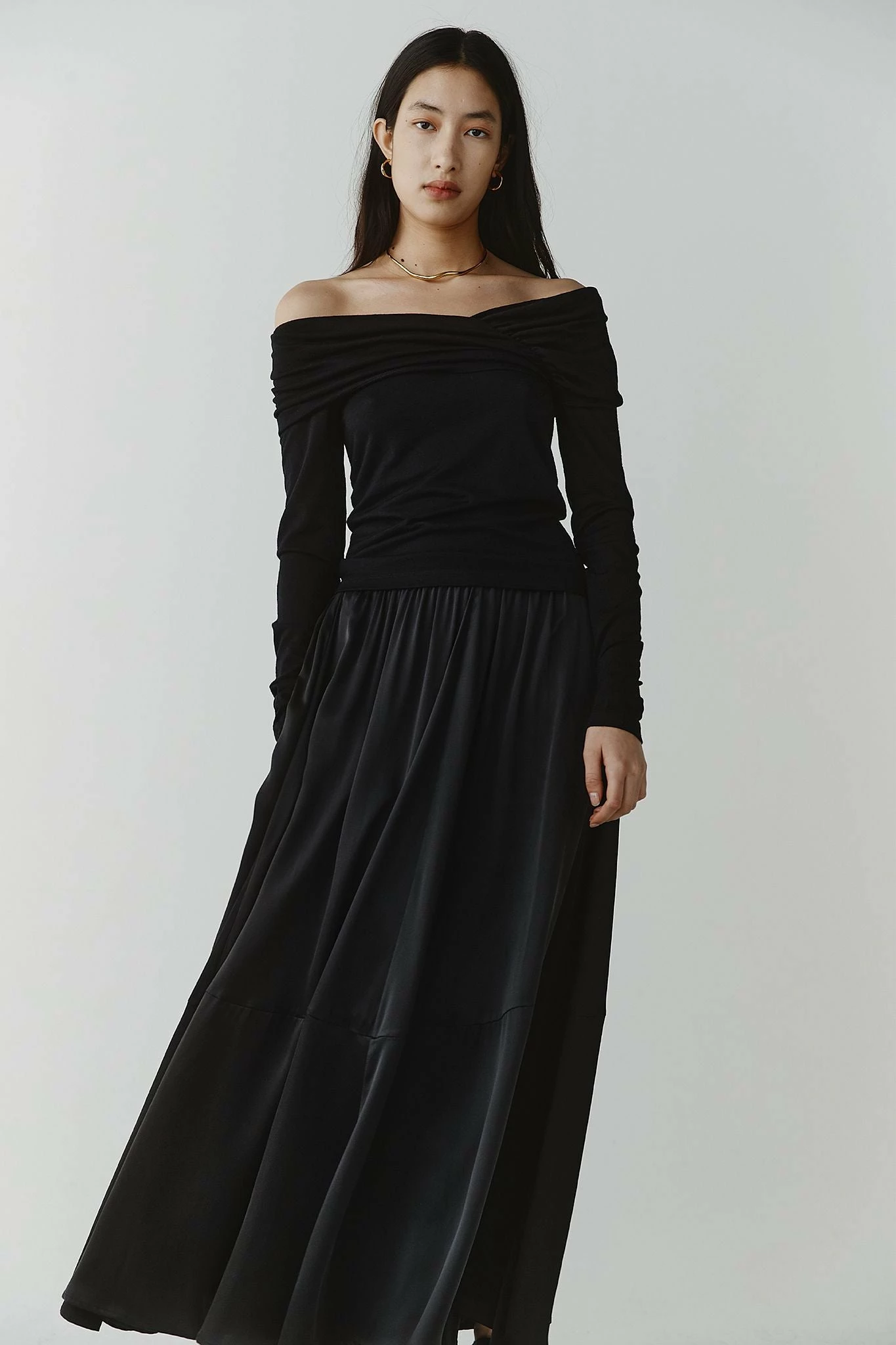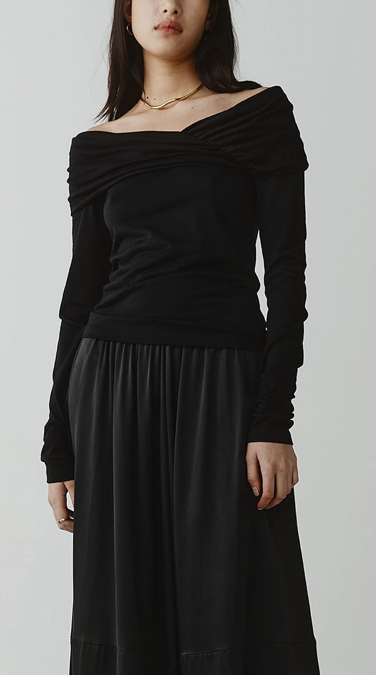 The Marle Wilma Top in Black is an iteration of the fan favourite Zellie Top. Featuring a slim silhouette, long sleeves and cross-over detail that wraps around the body and falls off the shoulder creating a feminine silhouette. This top is finely knitted in 100% merino.