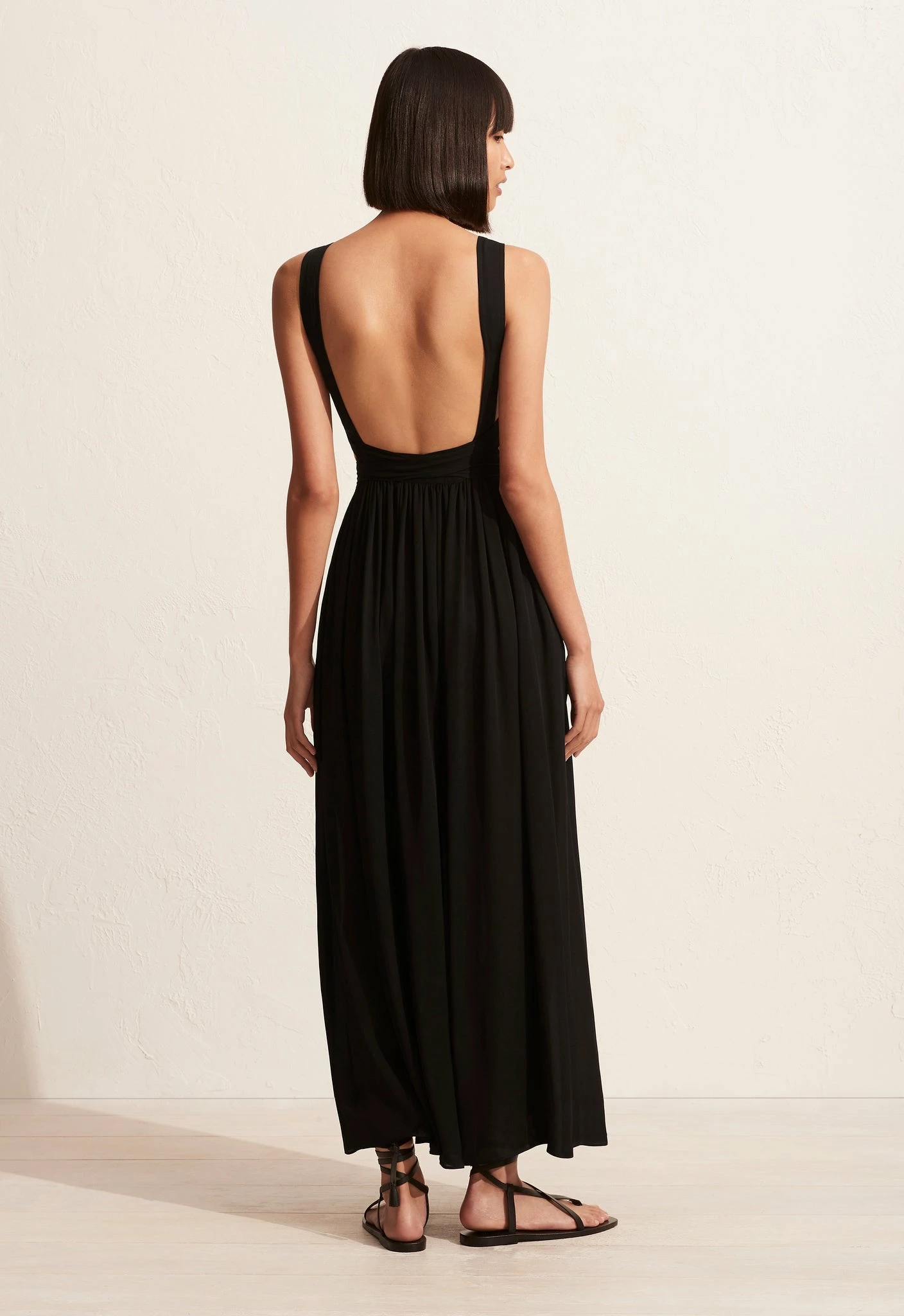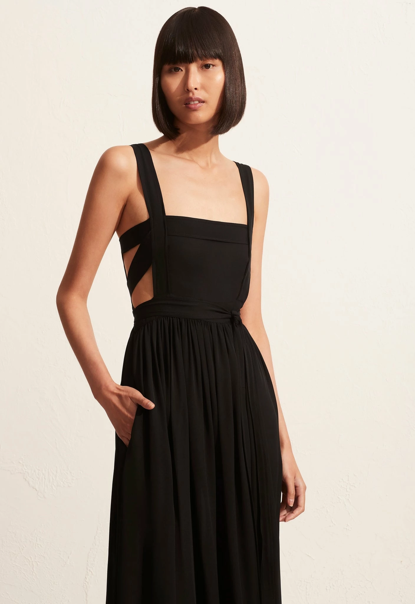 The Banage Wrap dress by Mattearu is an elegant mid-length dress, made from lightweight double georgette silk and finished with equisite details. Featuring a straight neckline, this piece has a self-lined bodice with fixed wide shoulder straps and long waist ties that extend from the front bodice to wrap around the body and tie at either the front or back. The skirt is fitted through the high waist, with a band providing soft gathers. Complete with side pockets and an invisible zip at the side waist.Â