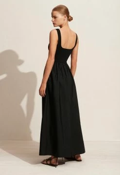The Matteau Knit and Cotton Dress in black is a 90s inspired dress with a knit bodice and a full gathered cotton skirt. Pull-on style with side pockets. Bodice in dry handle viscose blend bandage knit. Skirt in crisp European poplin cotton. Assembled in Australia.