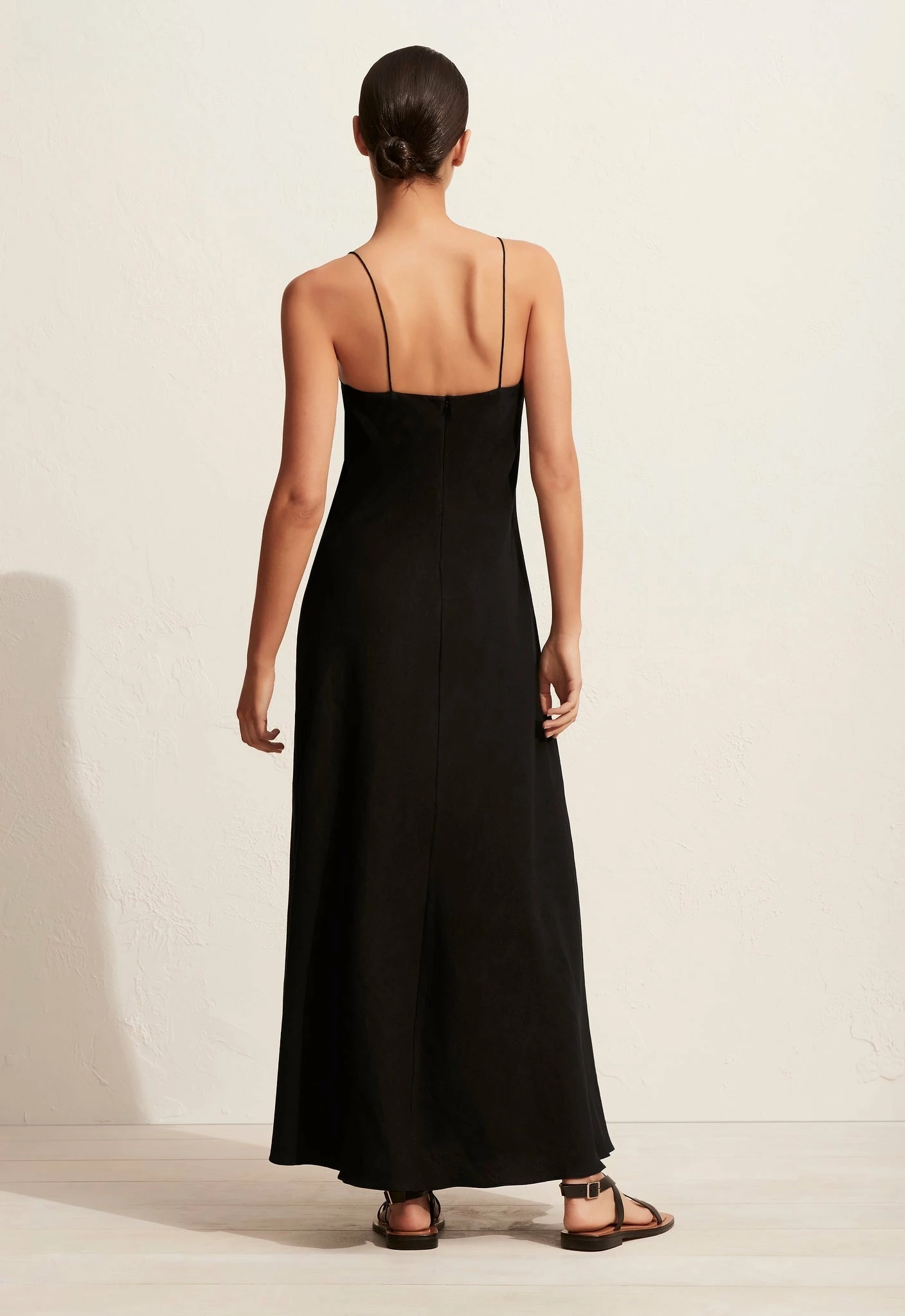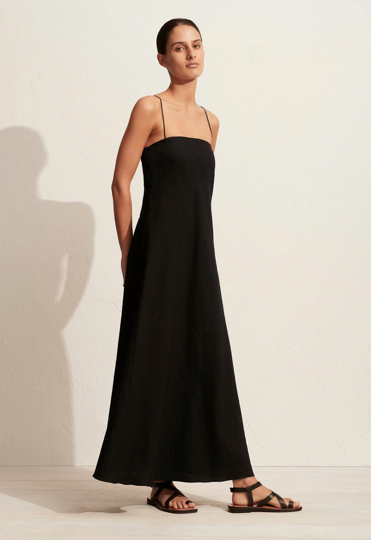 The Matteau Linen Bias Dress in Black. A bias column dress with an elasticated internal bustier with fine straps.