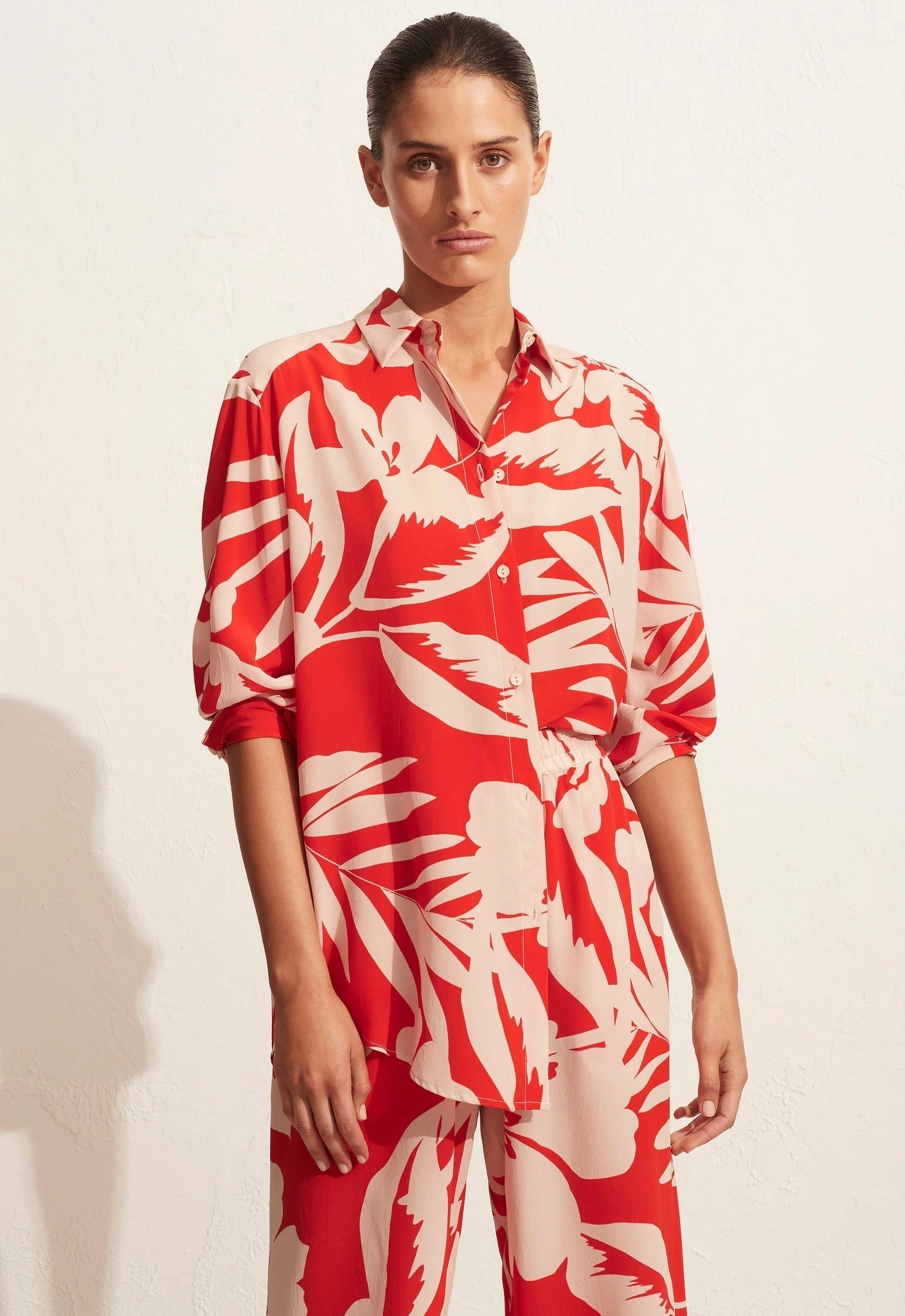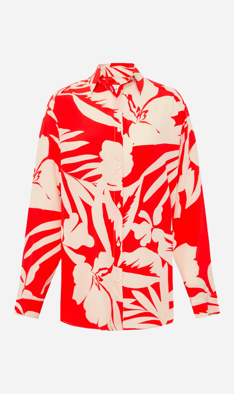 The Matteau Long Sleeve Silk Shirt is a classic relaxed long sleeve shirt in the brands signature hand-washable silk crepe de chine. Featuring a button-front, with side splits and a curved hemline. A closer fit, take your usual size or go one up for the more relaxed fit. Pair with blue denim for a true holiday vibe.Â
