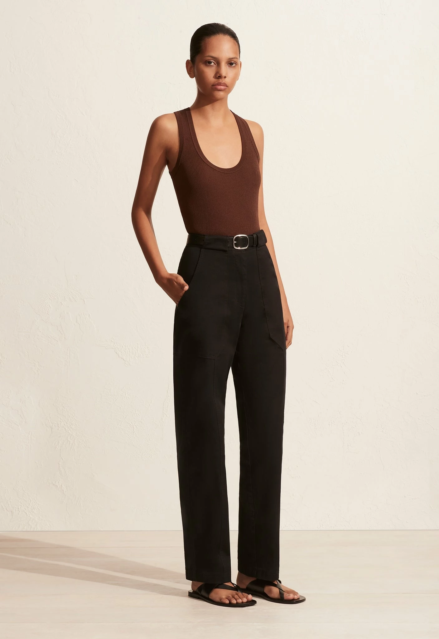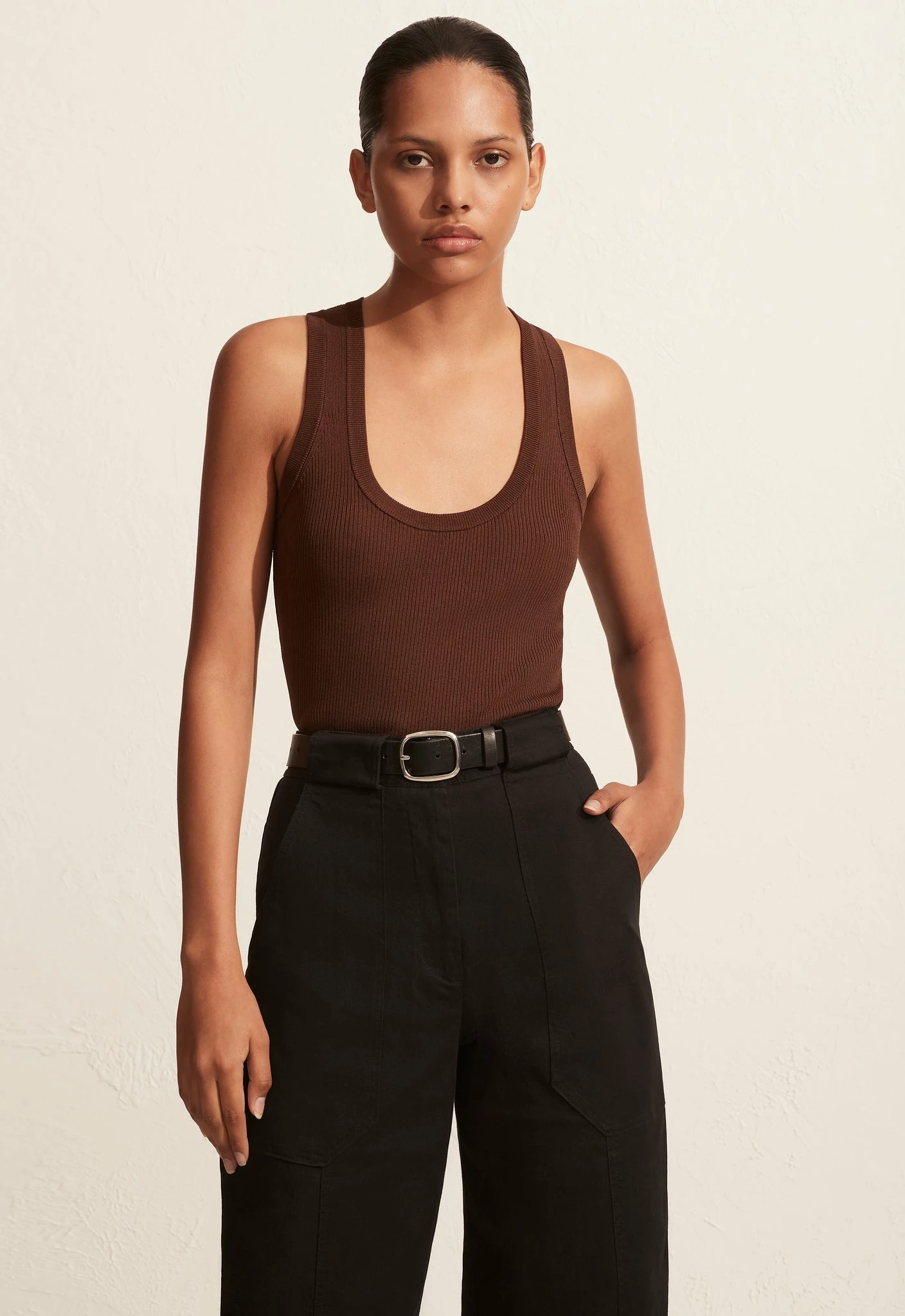 The perfect ribbed tank with a deep scooped, elegant neckline. Made from dry handle viscose blend the Ribbed Tank by Matteau has a snug fit. Wear it with nearly everything, including a slouchy pant or summer skirt.Â