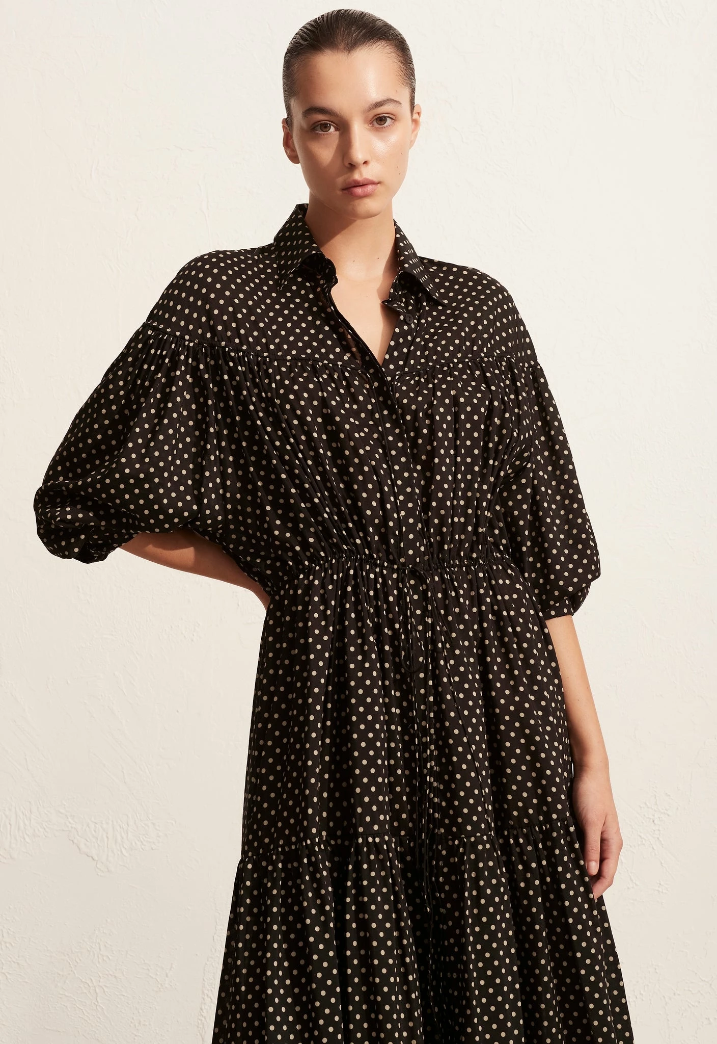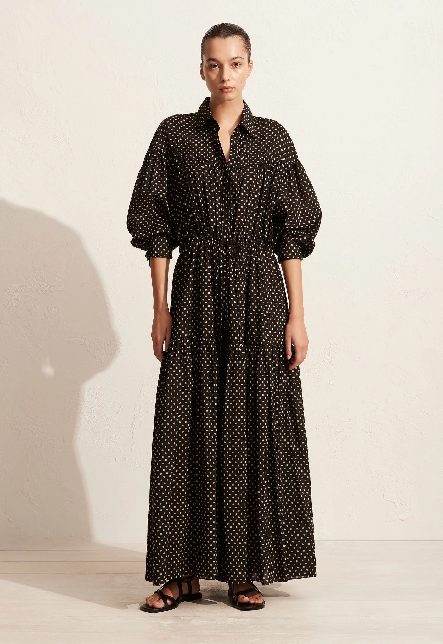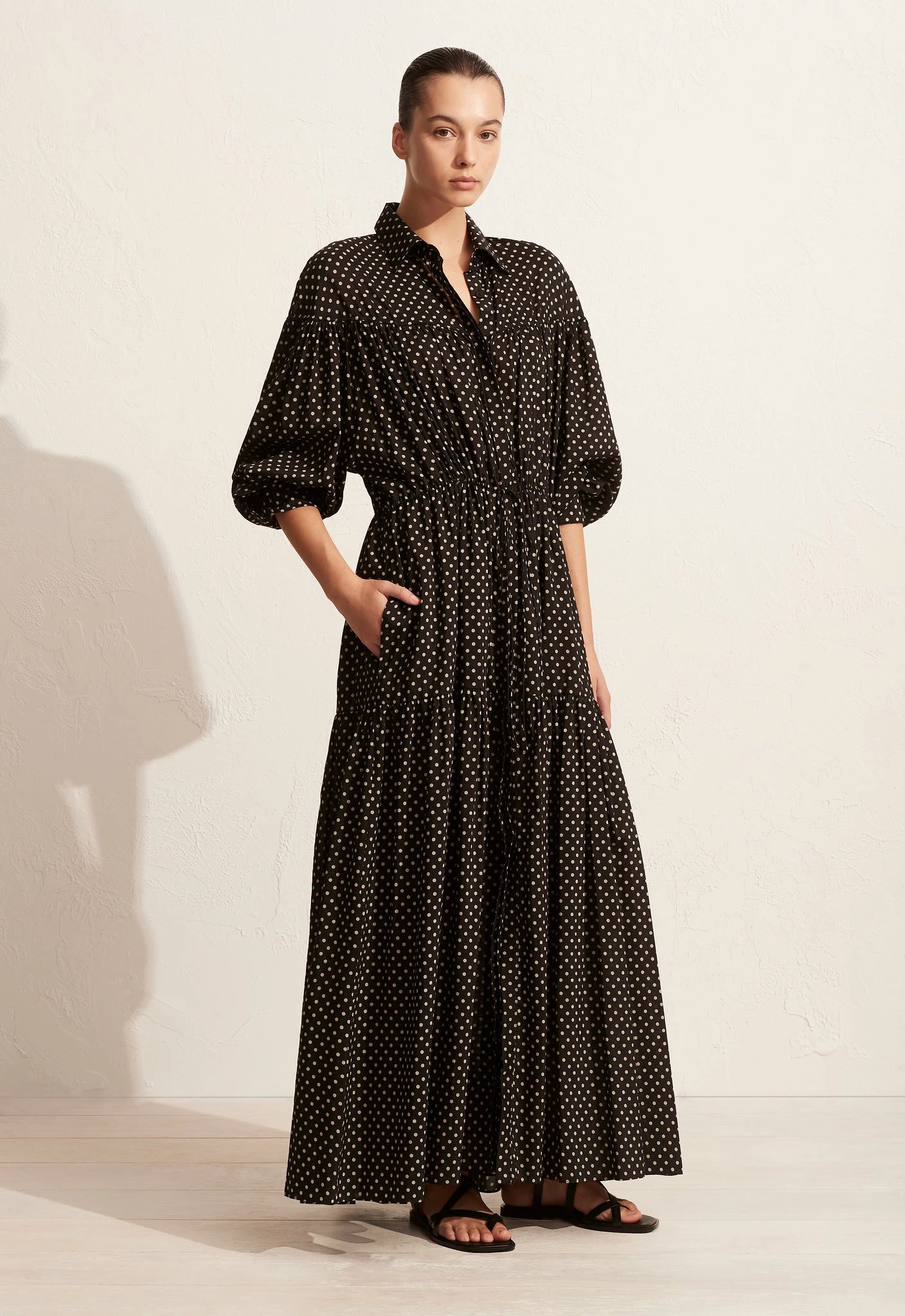 The ultimate in summer elegance, the Tiered Drawcord Dress is a voluminous and soft gathered maxi dress with traditional shirt details. Featuring a shirt-like collar and concealed button placket to hem this dress featured an adjustable drawcord with tie at yoke and waist. A relaxed fit sleeve with a button cuff completes the look alongside practical side pockets.Â