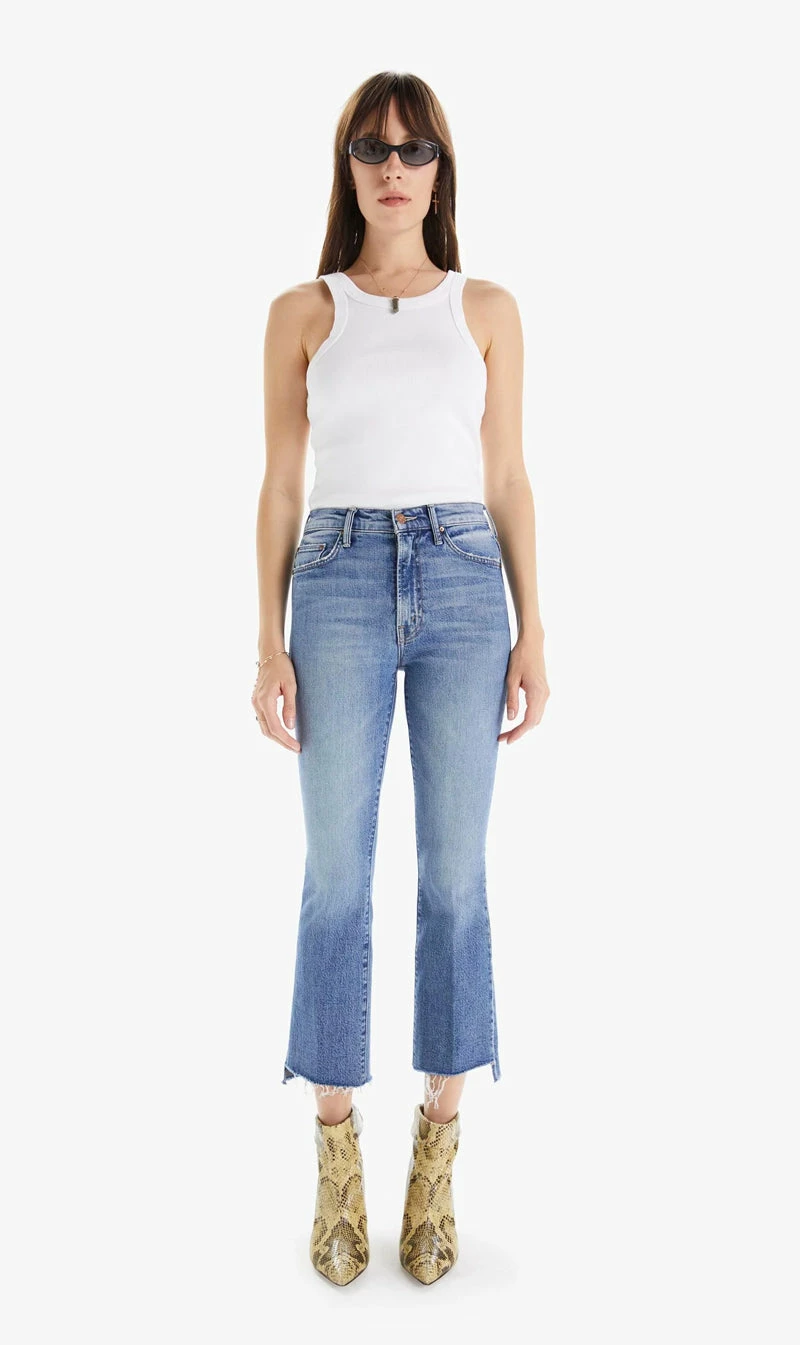 The Mother Denim Insider Crop Step Fray in Scenic Route. Honk for MOTHER nature. This iconic high-waisted bootcut hits at the ankle with a frayed step-hem. The cropped jeans are cut from stretch denim in vintage blue wash with whiskering and fading throughout.