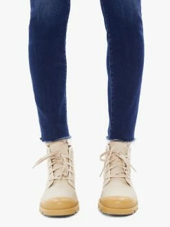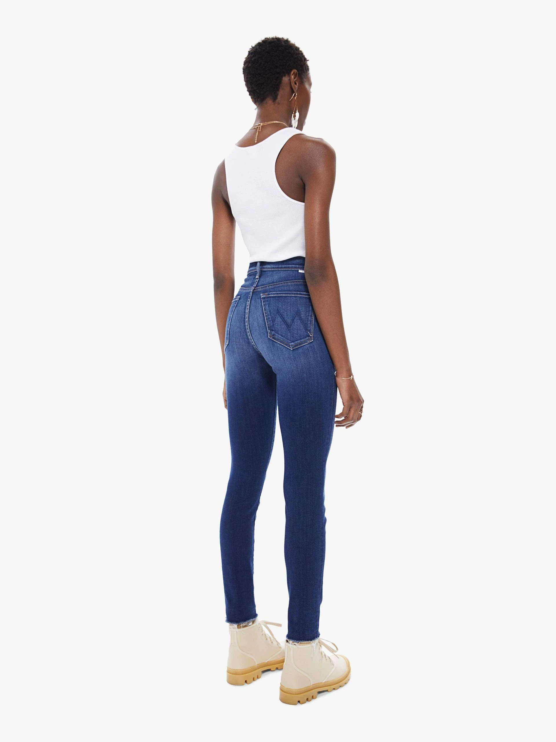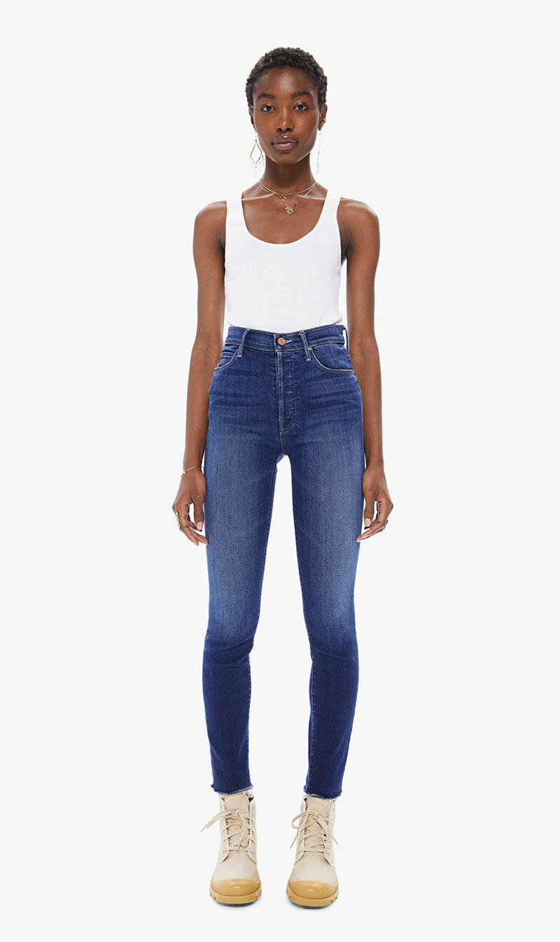 The Mother Denim The Stunner Ankle Fray in Sweet Lime. A high-rise skinny jean with a button fly, ankle-length inseam and frayed hem. Cut from stretch denim, Sweet Lime is a dark blue wash with super-subtle fading and whiskering.