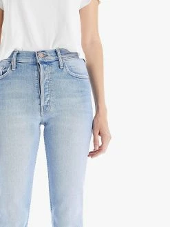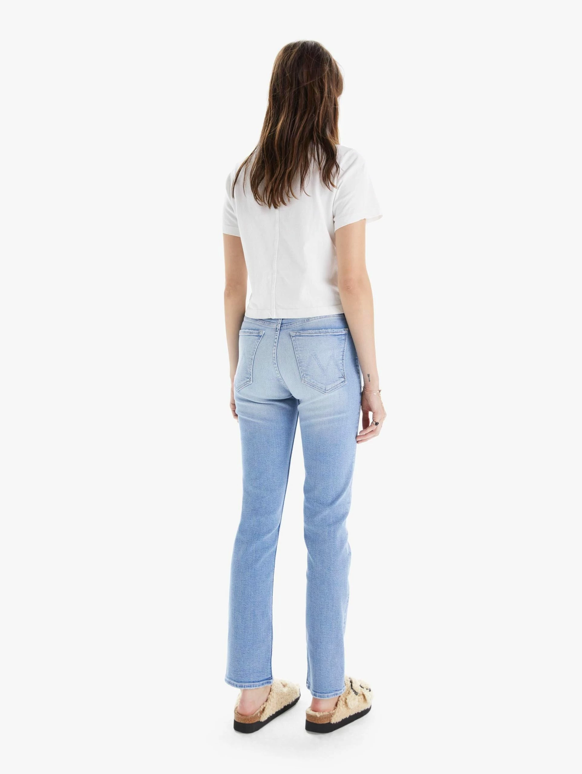 The Mother Denim The Tomcat Skimp in California Cruiser. Our bestselling high-rise straight leg with a button fly, 31-inch inseam and clean hem. Cut from stretch denim, California Cruiser is a light blue wash with fading and whiskering. The button-fly jeans pair well with sun-streaked hair, convertibles and Highway 1.