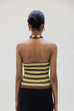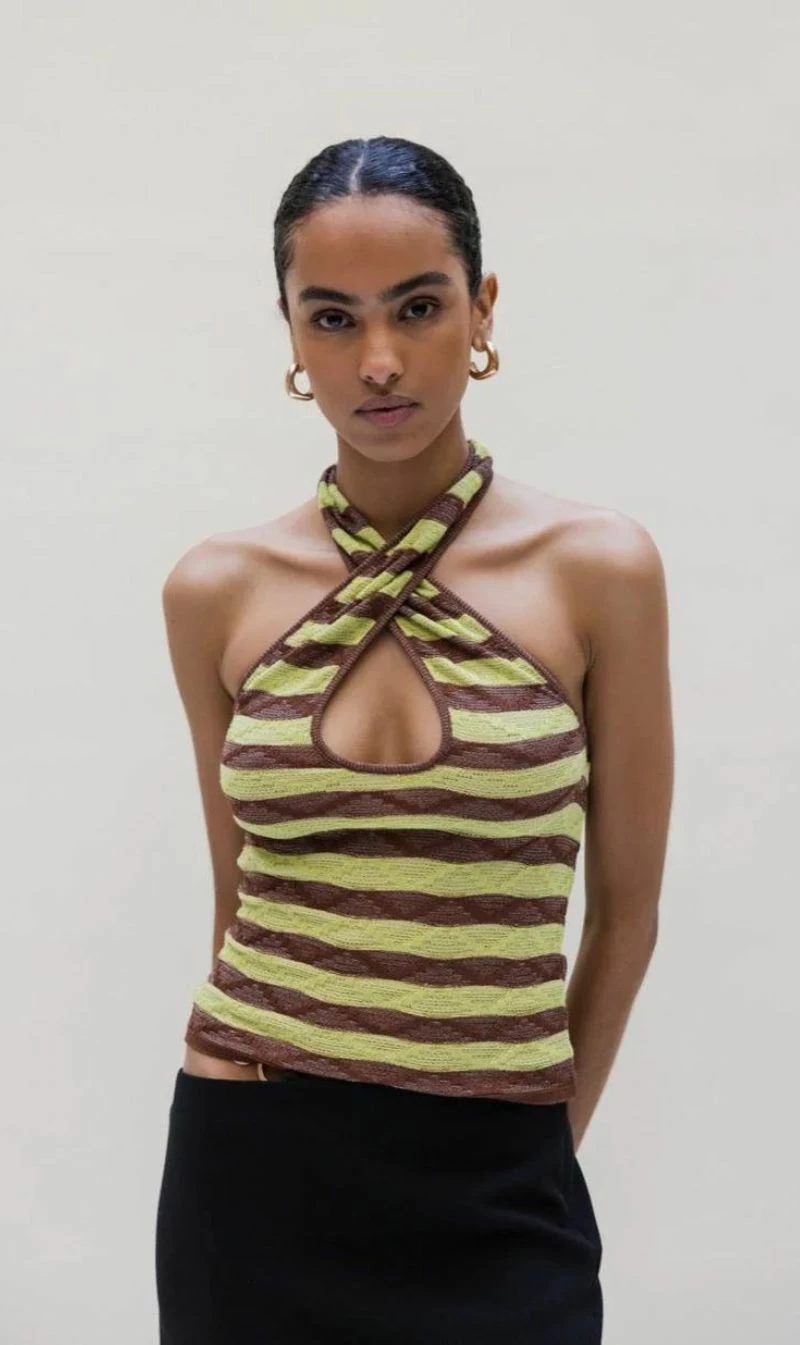 Sleeveless halter top with cross neckline, ultra stretch lycra mesh, fancy stitches.