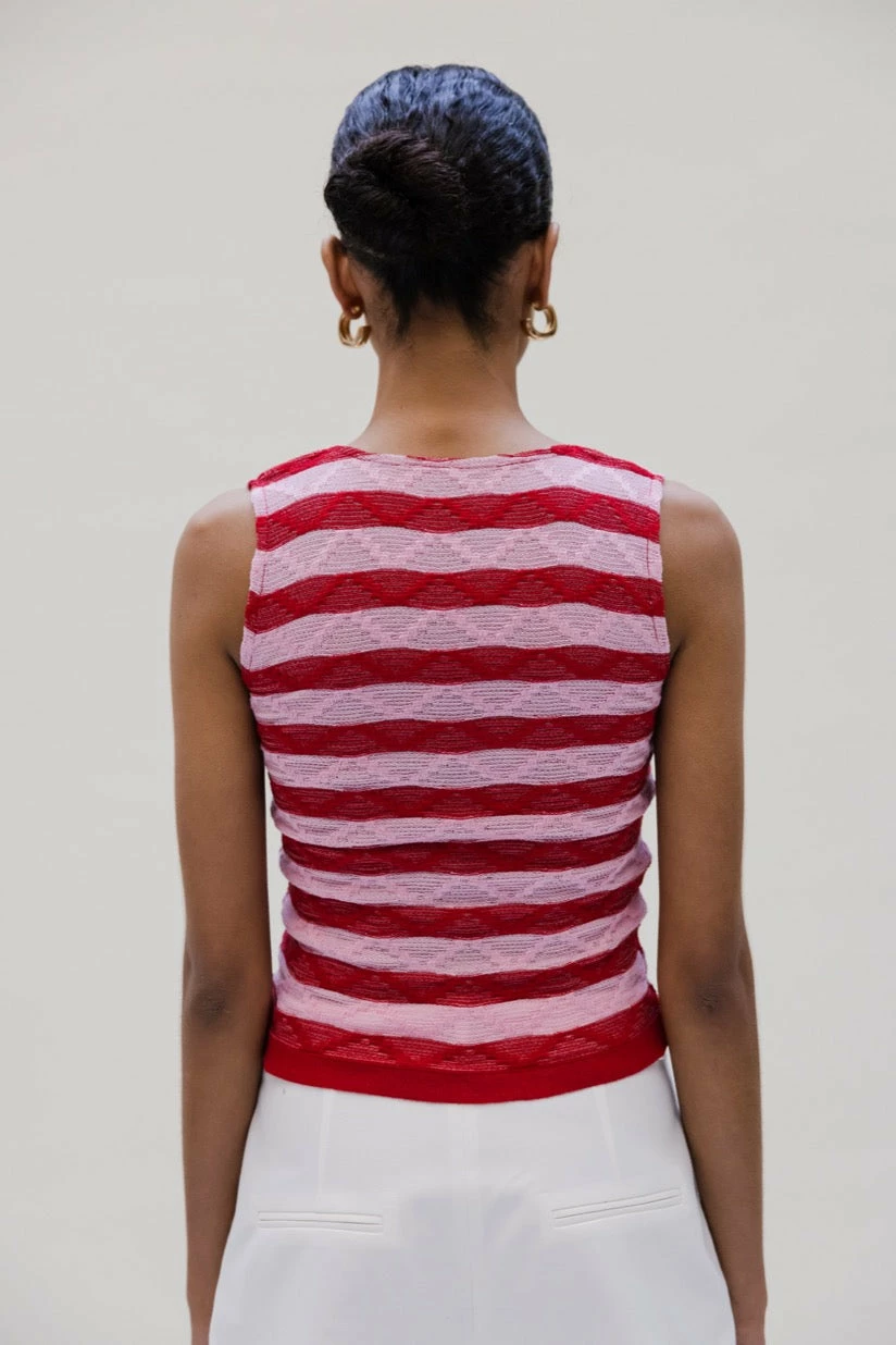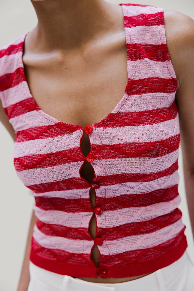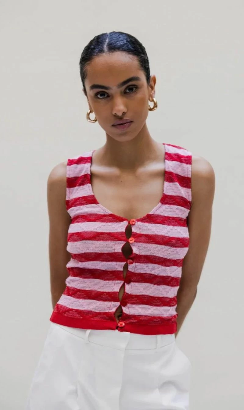 The playful Musier Paris Milos Pink vest is a sweet sleeveless buttoned vest in ultra stretch lycra knit, fancy stitches.