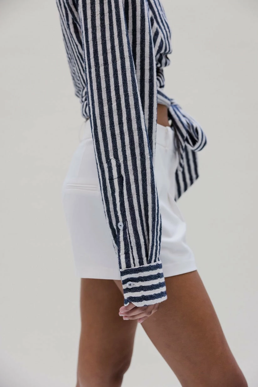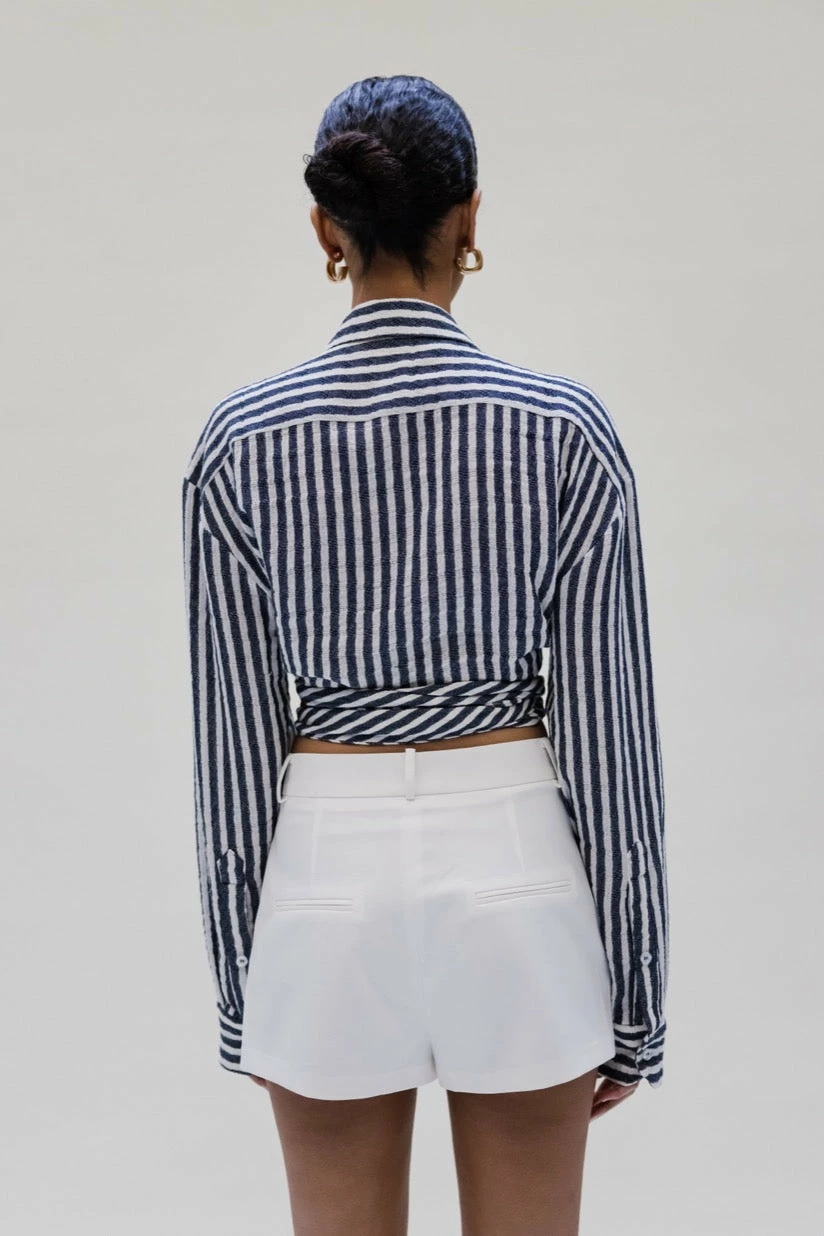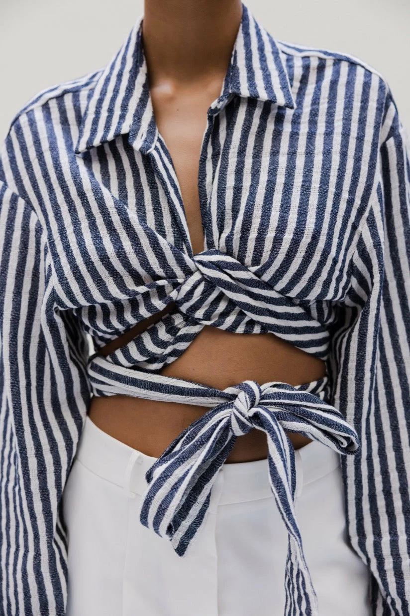 The Musier Paris Syros Top is a short oversized cropped style shirt with a tie around the waist. Dress up with some gold jewelry or dress down with some white shorts and sneakers.