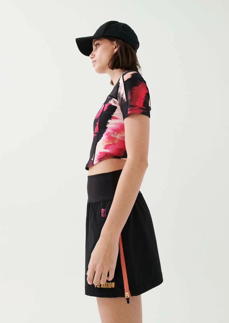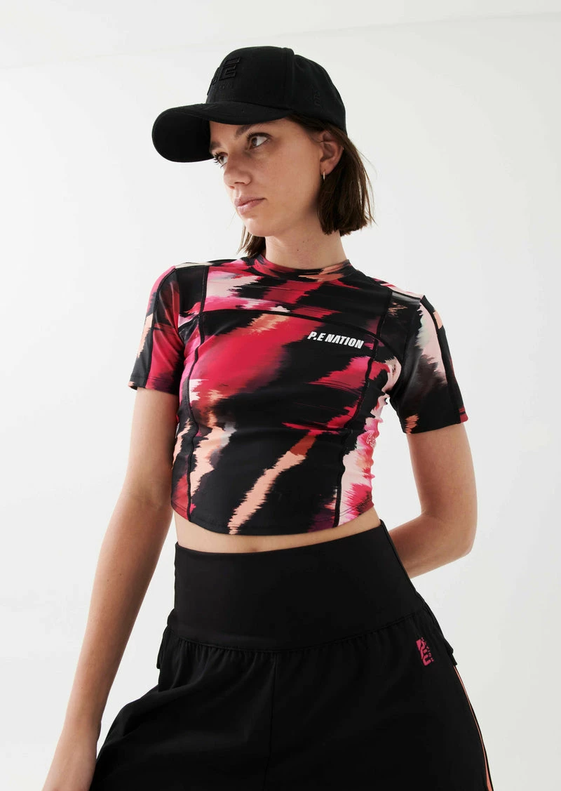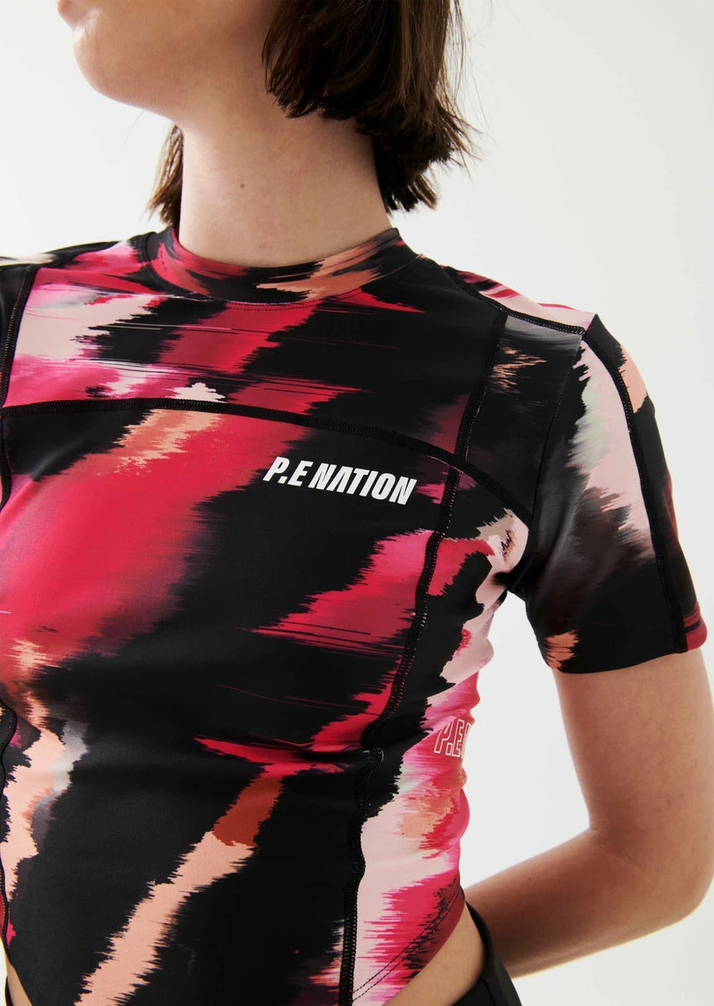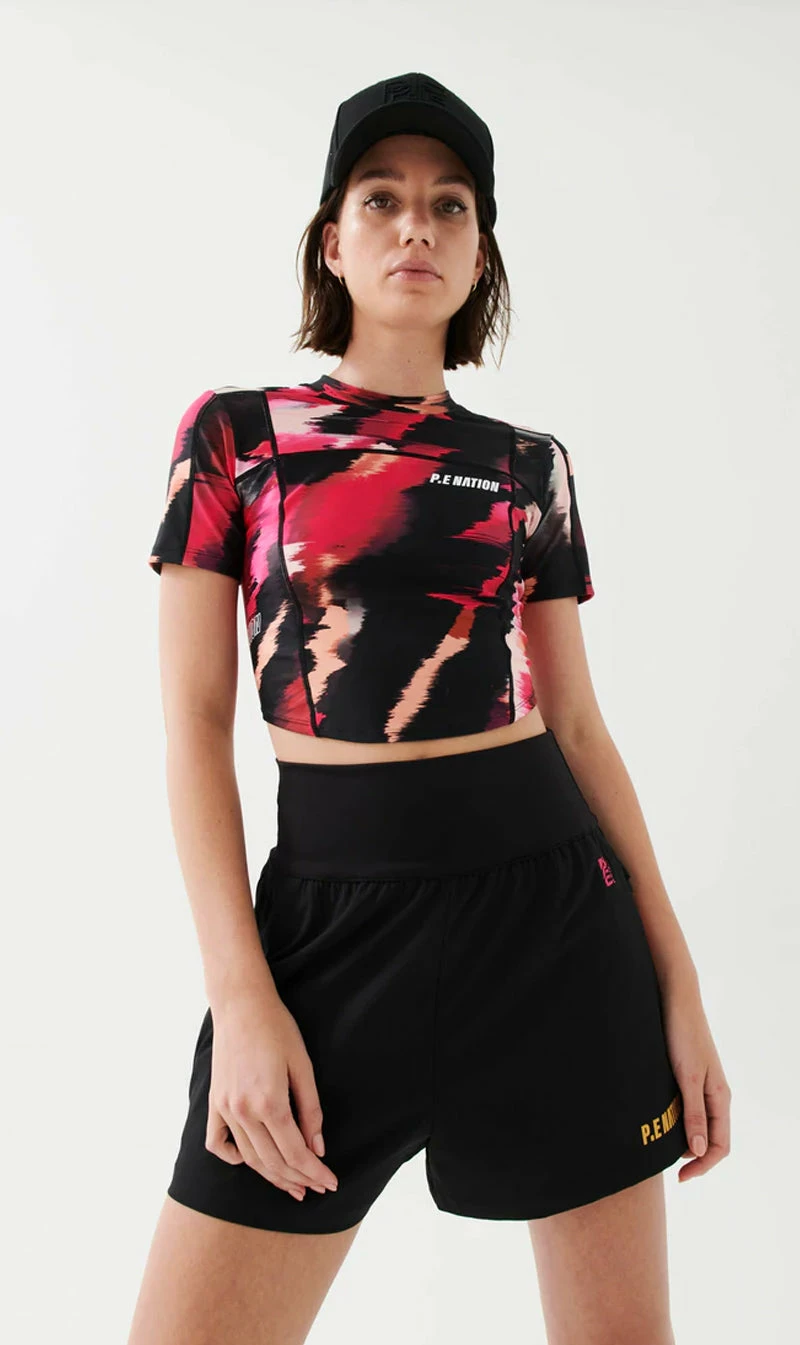 The P.E Nation Backswing Tee in Print comes as part of our It’s All In Me Collection. A fitted cropped active tee cut from our ultimate sustainable high-performance fabrication, this lightweight, flexible and breathable tee is built to withstand high-intensity training sessions, and designed with a custom digital multicolour print to look good everywhere. Featuring a high neckline with P.E Nation branded zipper on the back, the Backswing Tee features a neat fit and panel lines with coverstitching for a current look and comfortable feel. A P.E Nation logo on the chest and on the side panels elevate the overall appeal of this heightened essential.