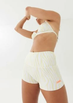 The P.E Nation Bronte Bikini Bottom in Print comes as part of the Colour Up Resort Collection. A high-rise 3” bike short style, the Bronte Bikini Bottom is fully lined for comfort and confidence in and out of the water, with a mellow yellow and white zebra-style custom digital all over print. Built-in waistband support keeps the short in place, while a P.E Nation contrast fluro logo patch at the hem completes the look.