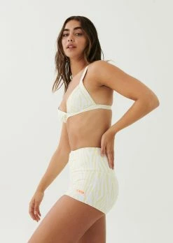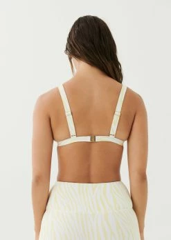 The P.E Nation Bronte Bikini Top in Print comes as part of the Colour Up Resort Collection. A triangle style bikini top with crossover strap detail at back, the Bronte features adjustable straps with gold-plated hardware to help shape and size to fit. Lined at the front, with an elasticated waistband and gold-plated P.E Nation clasp centre-back, the Bronte features a mellow yellow and white zebra-style custom digital all over print.Â