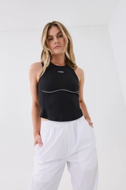 Built-in bra-like structure with a double panel at front and racerback detail with double strap, the Downtempo features subtle curved panelling and a curved hem to work back with active outfits or slouchy lounge or cargo pants. We like to style it with the Reverb Short, Intuitive Bike Short, Full Force Legging and Runyon Legging.