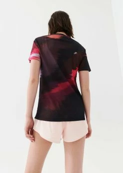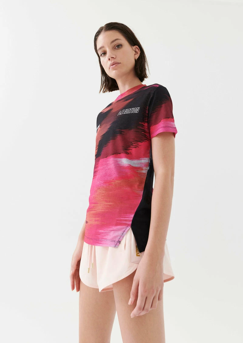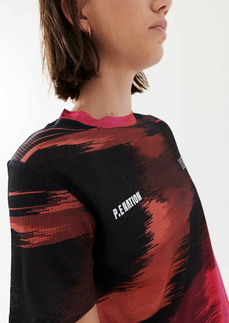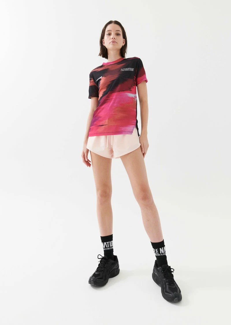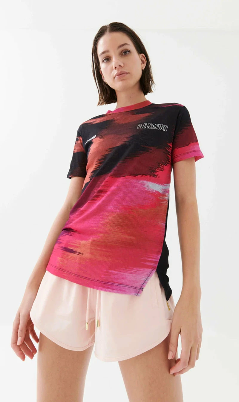 The P.E Nation Fluid Tee in Print comes as part of our It’s All In Me Collection. A relaxed fit lightweight style, the Fluid Tee has a semi sheer finish for an elevated layer to add to wardrobe. The classic crew neck shape is matched with a bold abstract camo-style print designed to stand out – with each T-shirt random cut to make every garment one of a kind. A twisted side seam panel line gives a unique point of difference, further elevating the tee. Two contrast P.E Nation logos on the chest complete the style.
