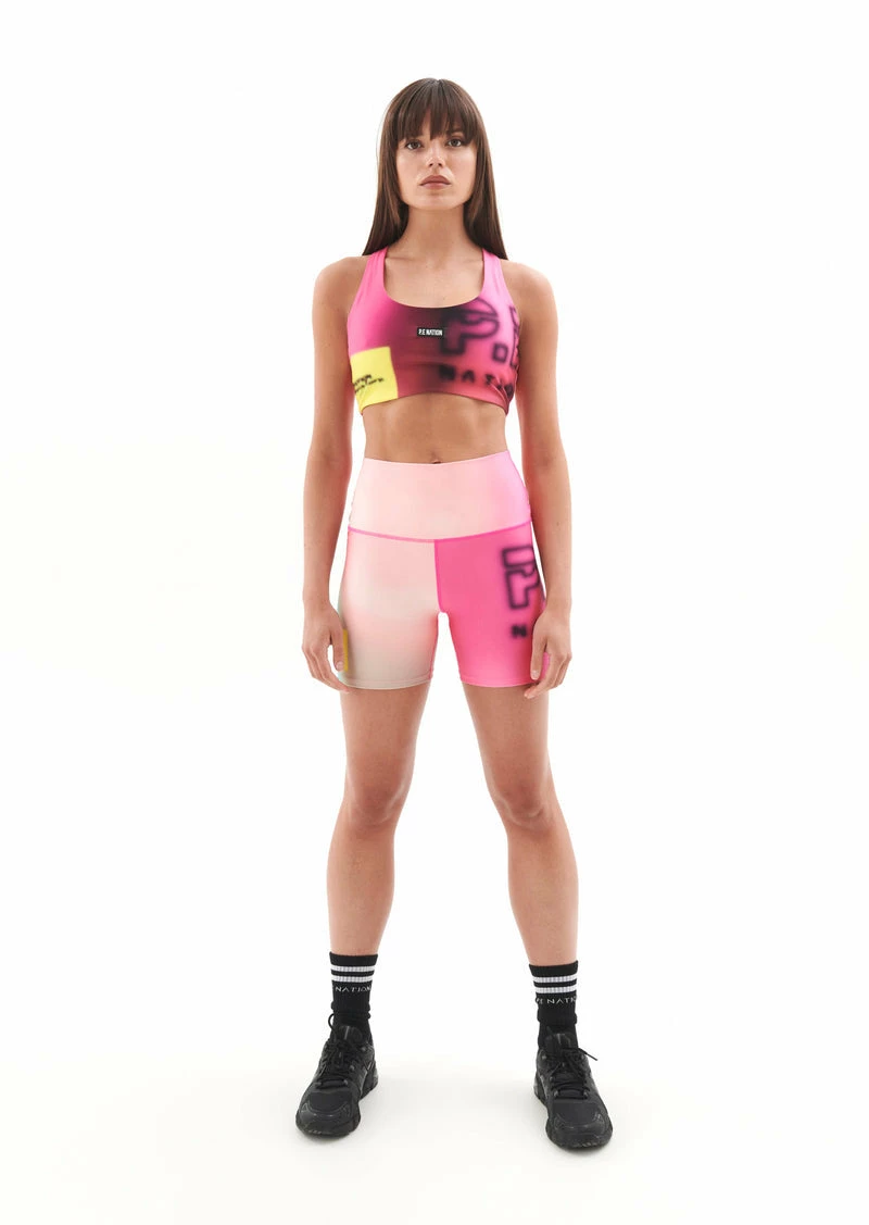 The Immersion Sports Bra in Blur Print by PE Nation comes as part of the brands Ready, Set, Let’s Go Collection, designed to inspire sky high energy, the pursuit of all passions, an appreciation for the power of now and the endless possibilities hidden within present time. An active sports crop with scoop neckline and racerback, the Immersion Sports Bra features all over custom digital blur print in a mix of soft pastels and bold fluro. Made from recycled tech matte fabric, the Immersion has an elasticated under bust to support through low to medium training activities. P.E Nation branded logo patch sits centre front. Team it up with the Immersion Bike Short for a head to toe studio fit.