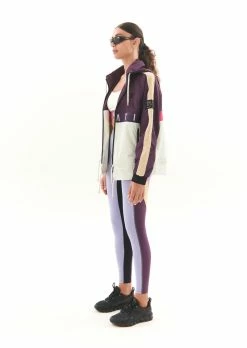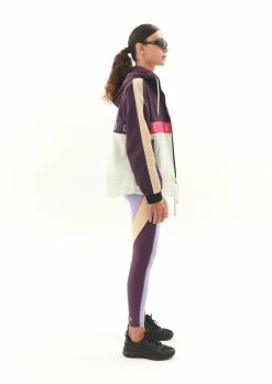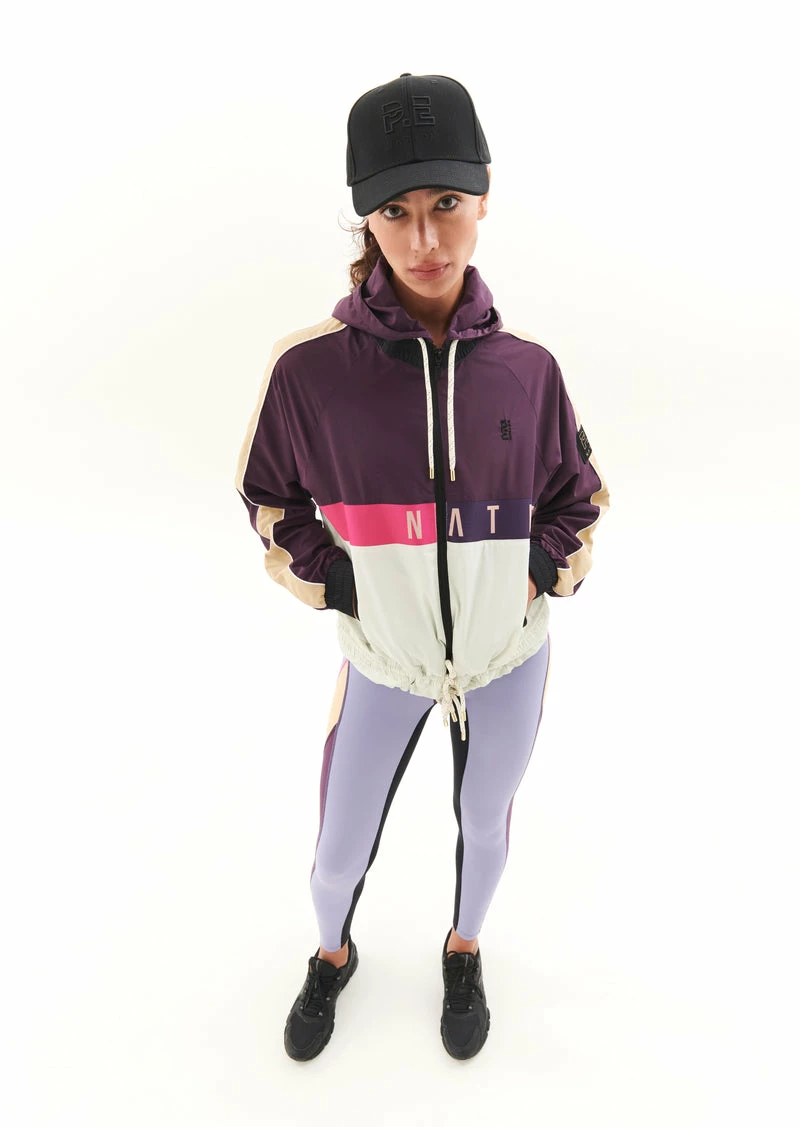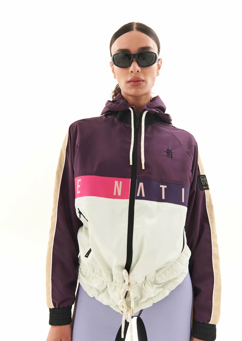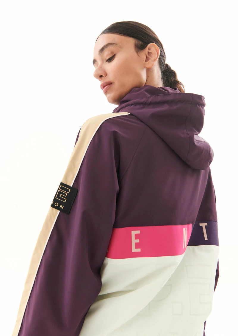 The Man Down Jacket in Purple Pennant by PE Nation comes as part of the brands incredible Ready, Set, Let’s Go Collection, designed to inspire sky-high energy, the pursuit of all passions, an appreciation for the power of now and the endless possibilities hidden within present time. The ultimate lightweight water-resistant layer for trans-seasonal wear, the Man Down Jacket is a classic P.E Nation spray style. Featuring a generous hood, elasticated cuffs and functional drawcords at the hood and hem, with a gold-plated centre-front zipper to style your way and stay protected from the elements. This version features a full block off-white colour panel on the lower half and deep muted purple on the upper. A multi-tone P.E Nation logo band at centre gives a signature P.E fluro pop.Â