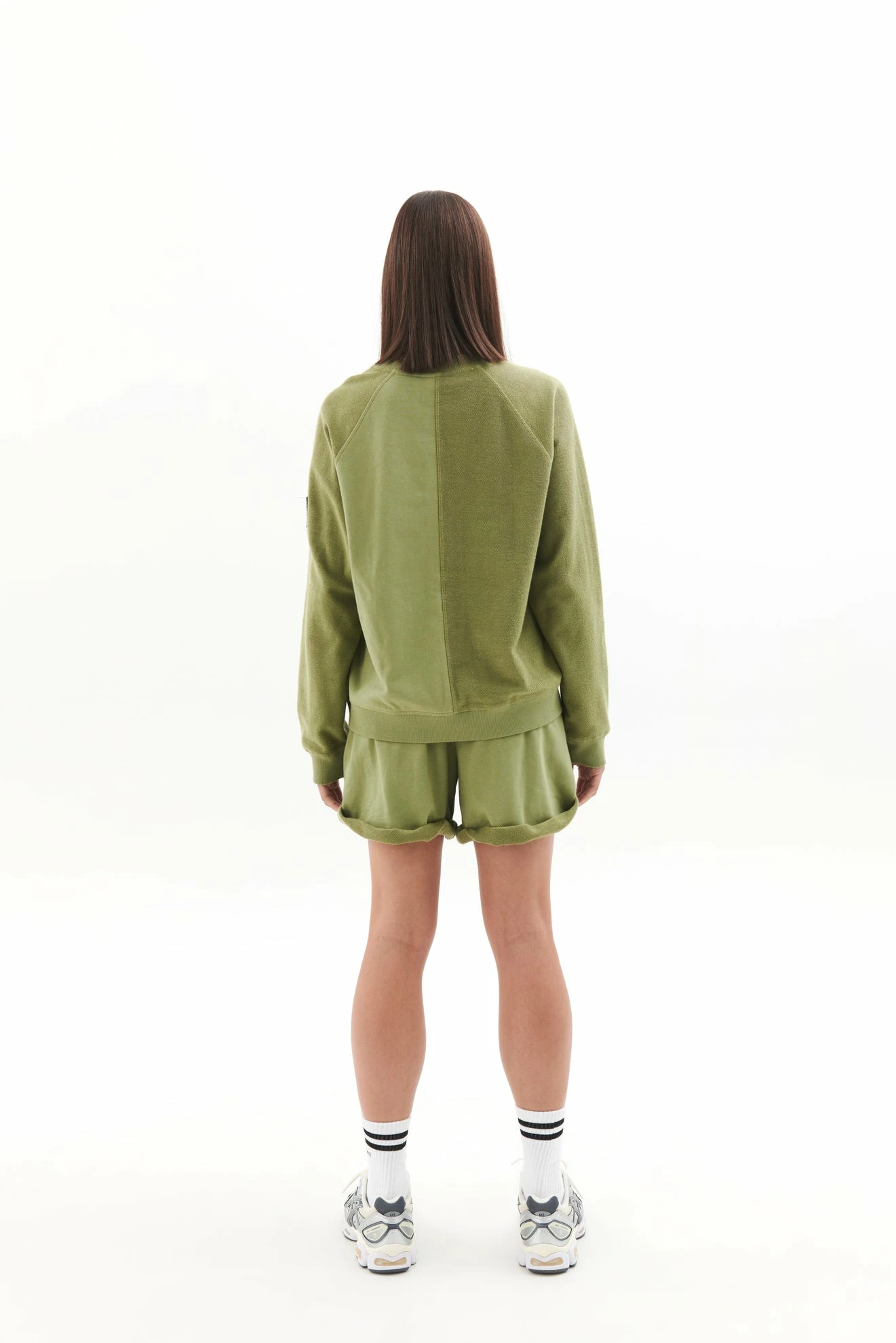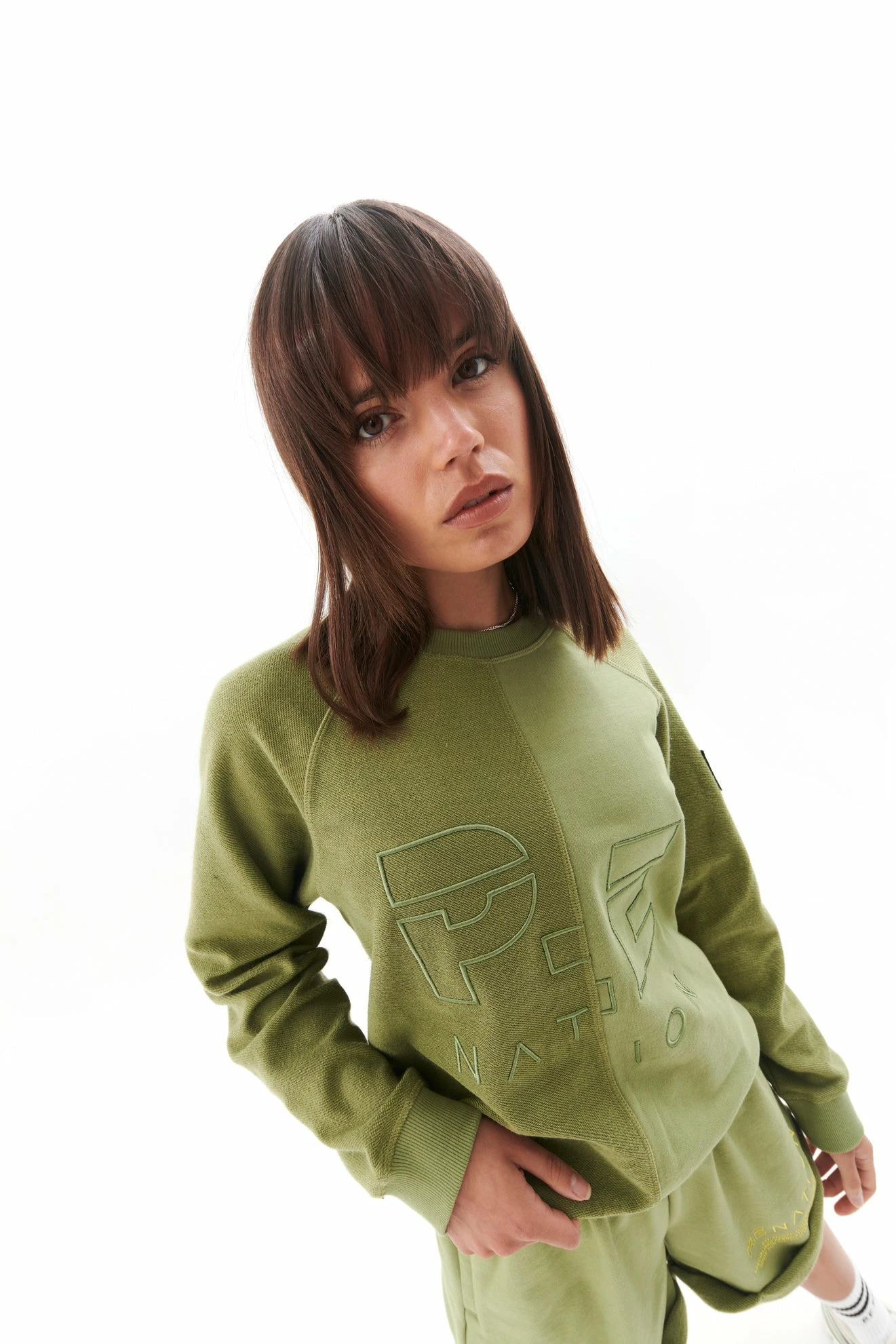 The Observation Sweat in Sage by PE Nation comes as part of the brand’s Ready, Set, Let’s Go Collection, designed to inspire sky high energy, the pursuit of all passions, and an appreciation for the power of now and the endless possibilities hidden within present time. A relaxed fit sweat, the Observation features double texture design detail, with smooth organic cotton panels matched with reversed French terry. Classic P.E Nation ‘Heads Up’ embroidered logo at the front gets a spliced treatment. Ribbed crew, cuffs and hem provide added visual difference and styling opportunities.Â