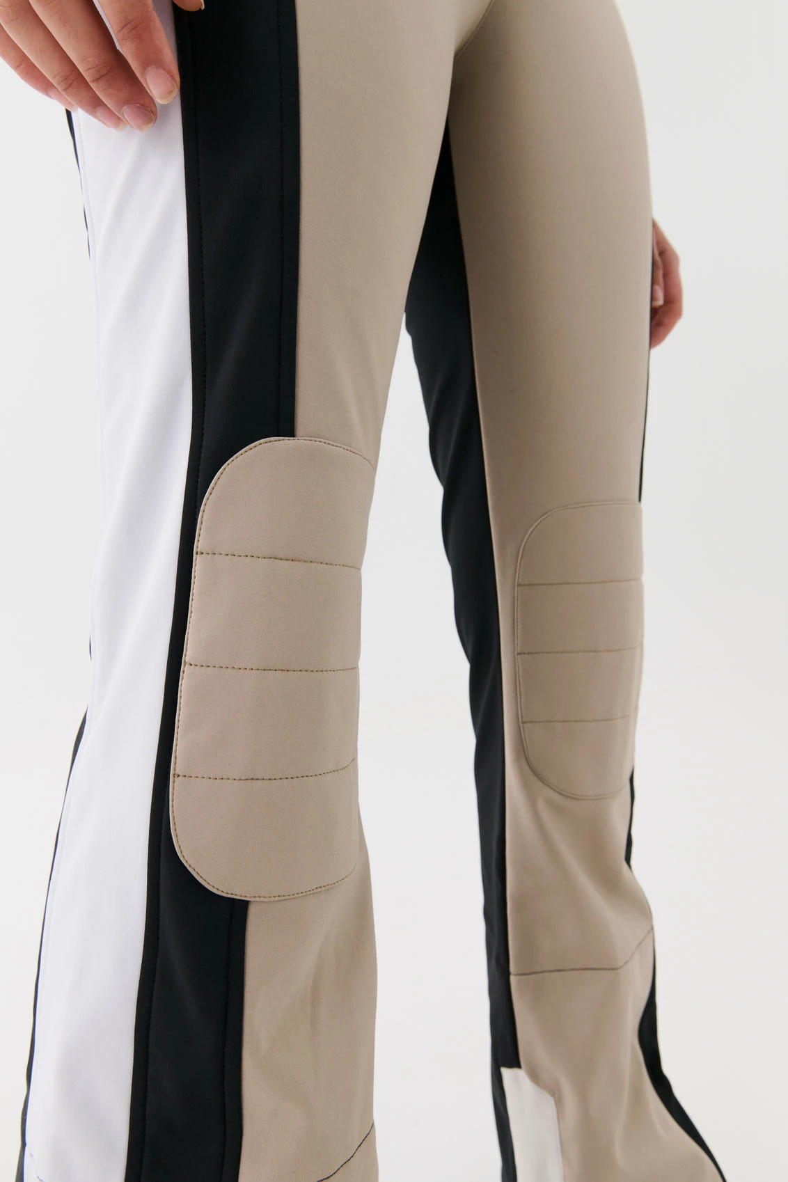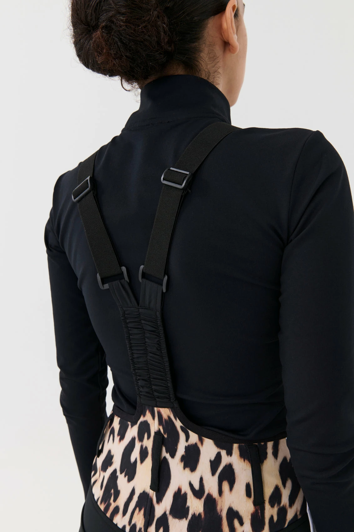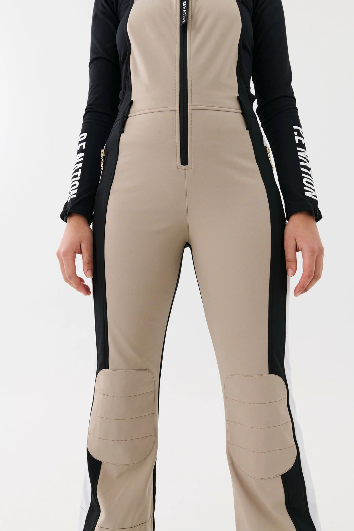 A flared jumpsuit with a detachable elasticated belt to define your waist, the St. Moritz Snow Boiler is designed for a slim fit. The St. Mortiz Snow Boilersuit is a one-piece made from approx 10K waterproof rated, recycled breathable fabrication, offering a waterproof and windproof body with fully taped seam sealing for protection and durability. The built-in knee pads, snow guard at the bottom hem and adjustable shoulder straps offer the right support and protection to make it ideal for long days on the slopes. Layer it with the Slalom Top and St Moritz Snow Jacket. Â
