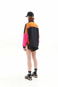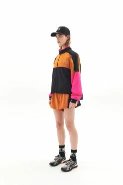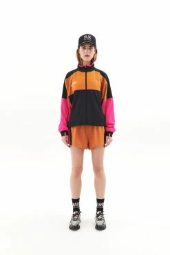 The Sequence Jacket in Golden Oak by PE Nation comes as part of the brands hotly anticipated P.E Nation x ASICS Collection. A true retro-sport capsule, blending custom P.E colourways and hypnotic wave print across athletic and everyday wear. Inspired by yesterday. Engineered for all of tomorrow. A relaxed fit classic P.E Nation spray jacket with centre front zipper closure, the Sequence Jacket features a retro-sport colourblocking design unique to the collaboration. The ideal layer up for before-and-after studio sessions and all-day active fits, the Sequence has a soft lightweight feel and mesh lining throughout. High funnel neck is matched with elasticated cuffs with thumbholes, concealed side pockets and functional drawcords in waistband to style your way. Fluro piping, hood lining and drawcords are matched with signature design detail in the heritage P.E flag trim on the cuffs. Flat print P.E Nation and Asics logos at front complete the jacket.Â