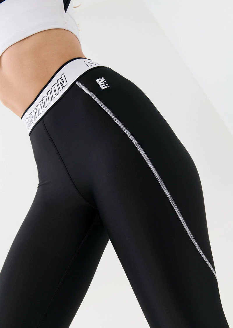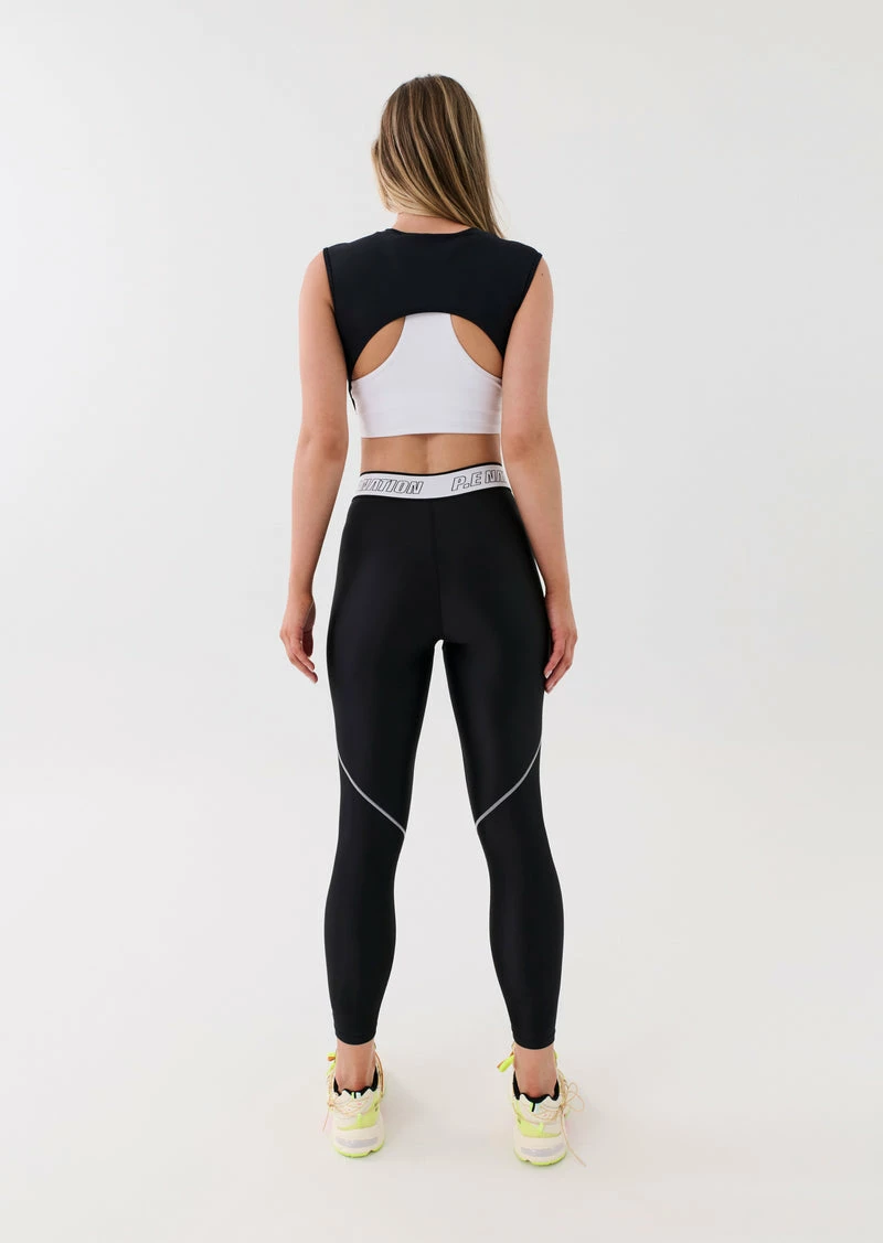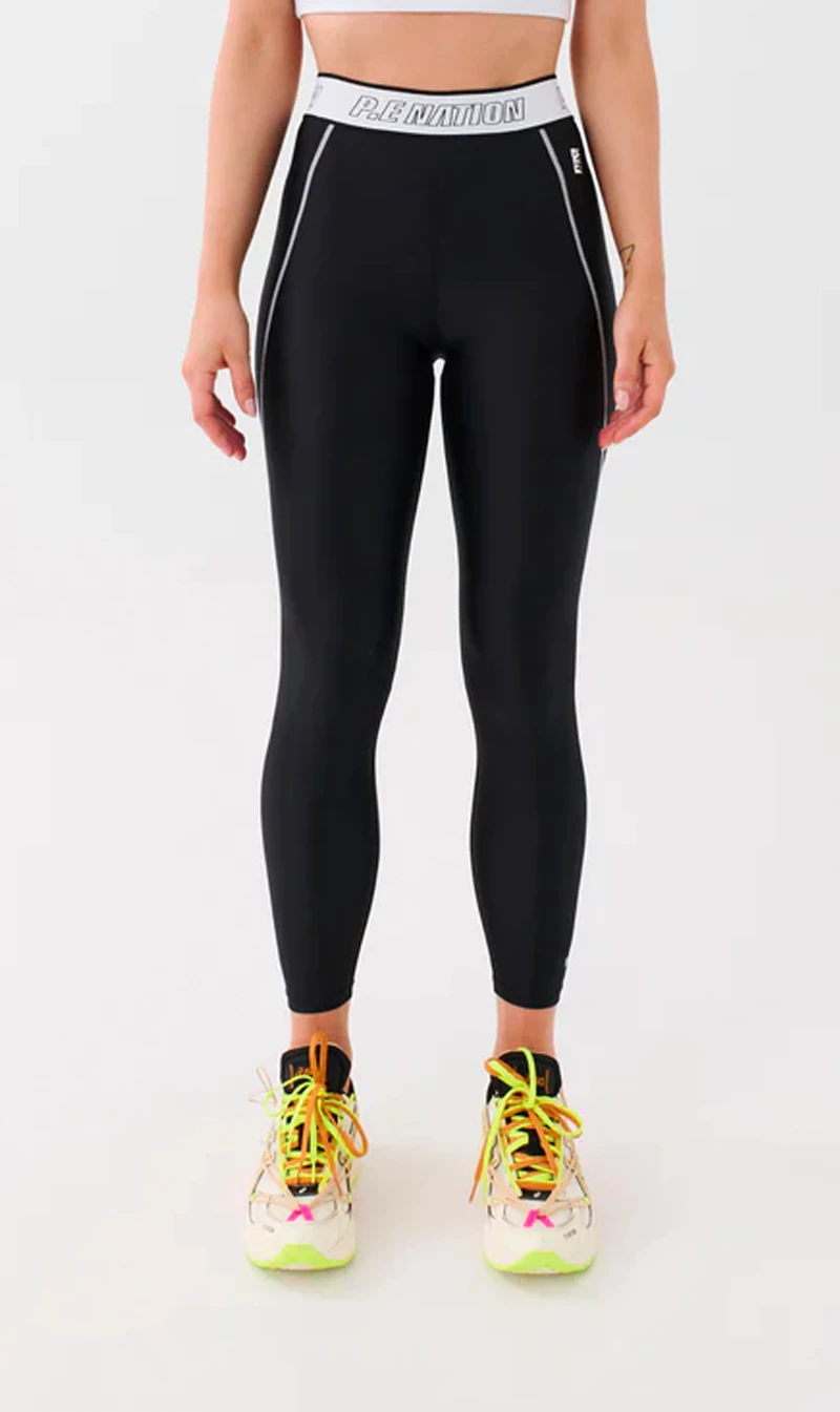 The PE Nation Reformer Legging in Black comes as part of our Ready. To Wear Collection, created for who you are. Engineered for what you do. A high-rise active style with a â…ž length finish, the Reformer Legging is cut from a sleek and shiny 70% recycled fabrication. A premium dry-wicking performance essential, the Reformer feels like a second skin, with P.E Nation built-in waistband support to move with you through gym training and HIIT sessions. Featuring a squat-proof all black main, the Reformer Legging also features white flatlock contrasting and finished with P.E Nation logo details at the hip and hem. We match it up with the Reformer Top and Represent Jacket.