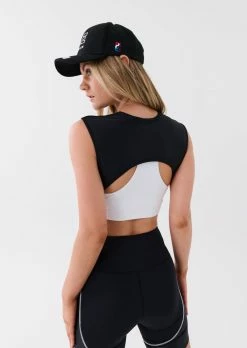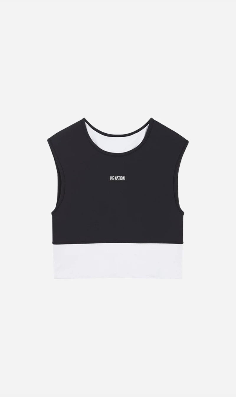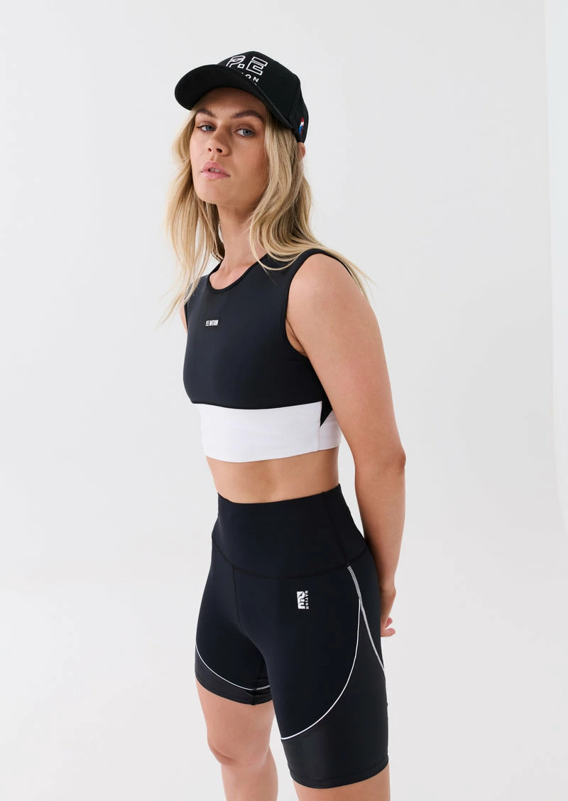 The PE Nation Reformer Top in Black comes as part of our Mainline Collection. A fitted active tank with a comfortable crew neckline, the Reformer Top in Black is a buttery soft, longline style crop top for everyday wear and movement. Contrasting elements of black and white are complimented by a feature racer style back silhouette. Cut in a premium sustainable fabrication and featuring a minimal P.E Nation logo, this can be styled back with the Reformer Bike Short or Rewind Bike Short in Overlay Print.