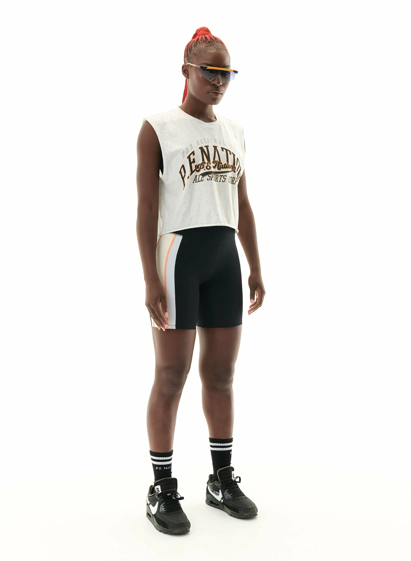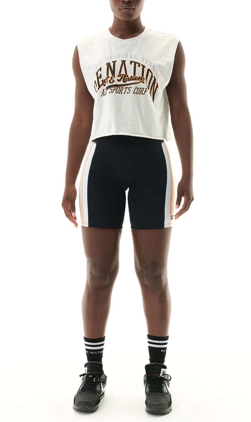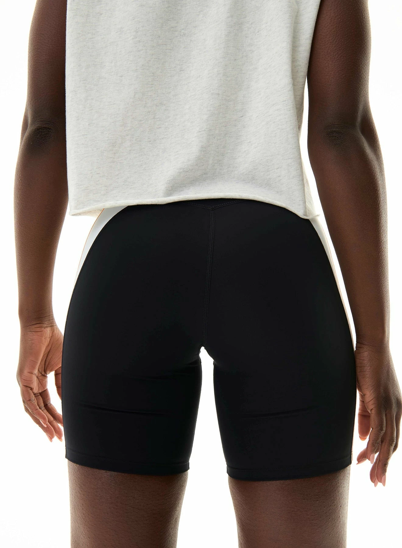 The P.E Nation Pipeline Bike Short in Black is an active bike short, that will help you push the limits. Featuring a soft matte finish fabrication for all-day comfort, it is the perfect performance layer for low-impact training and studio workouts. Crafted with a high-rise waist, 7″ length, and squat-proof compressive fabric. The internal waistband pocket at the center back provides you the ability to carry your essentials while you train.