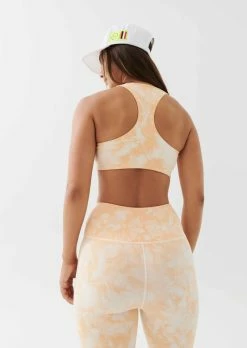 The P.E Nation React Sports Bra in Golden Sand comes as part of the Reimagined Oasis Collection. A fitted yoga sports bra, the React features a tie-dye style print. Each garment has been hand-finished individually, making each one unique and one-of-a-kind. Cut from a brand-new 95% organic cotton fabrication with a compressive structured fit and feel, the React Sports Bra is designed for yoga and other forms of low-impact training, such as Pilates and KAAIAA. Built in waistband support underbust keeps the crop in place so it moves with you through your sequences and sets. A gold-foil P.E Nation logo centre-front and logo patch at the back elevate the top further.Â