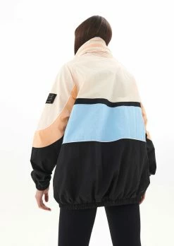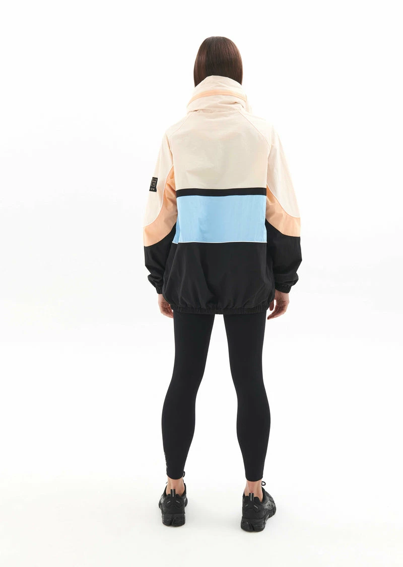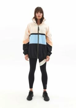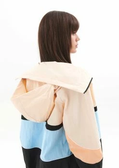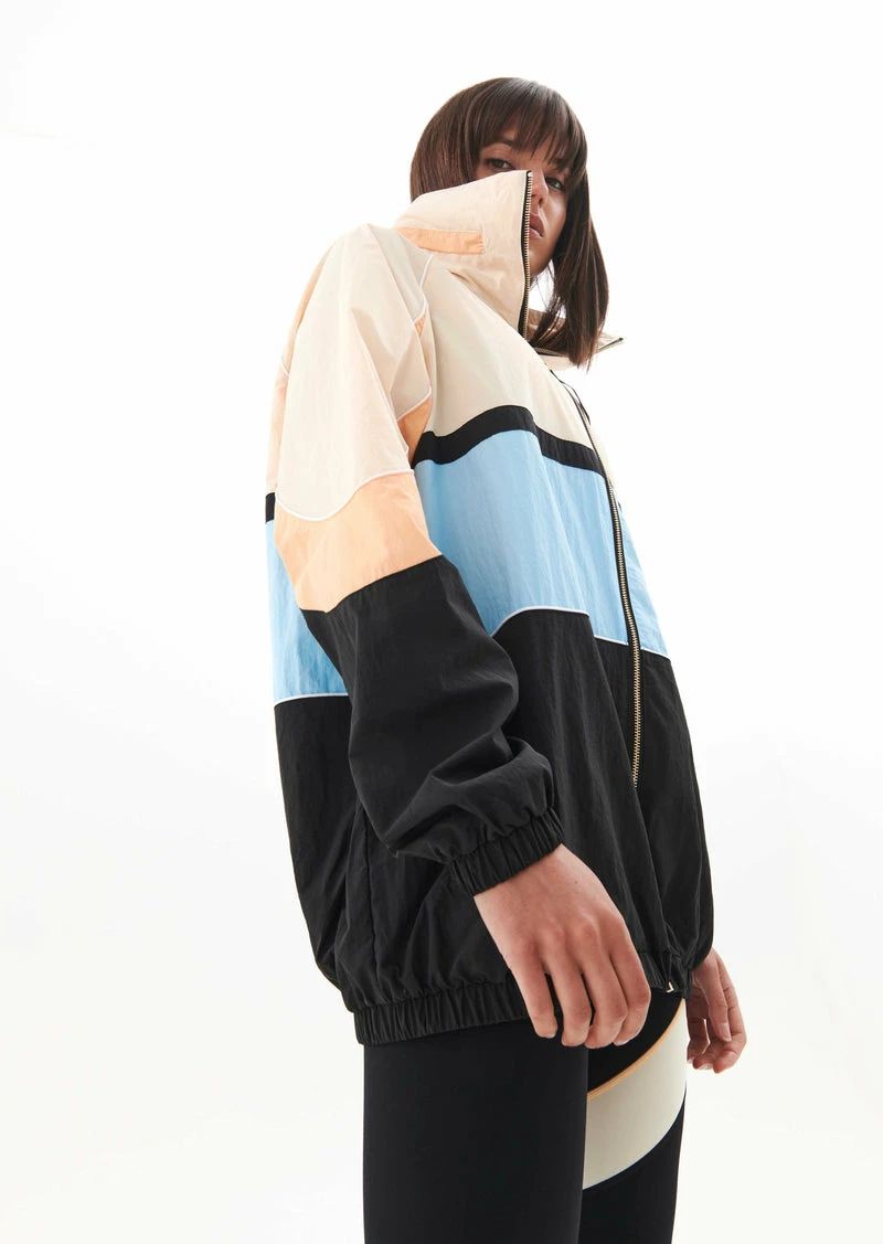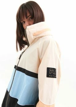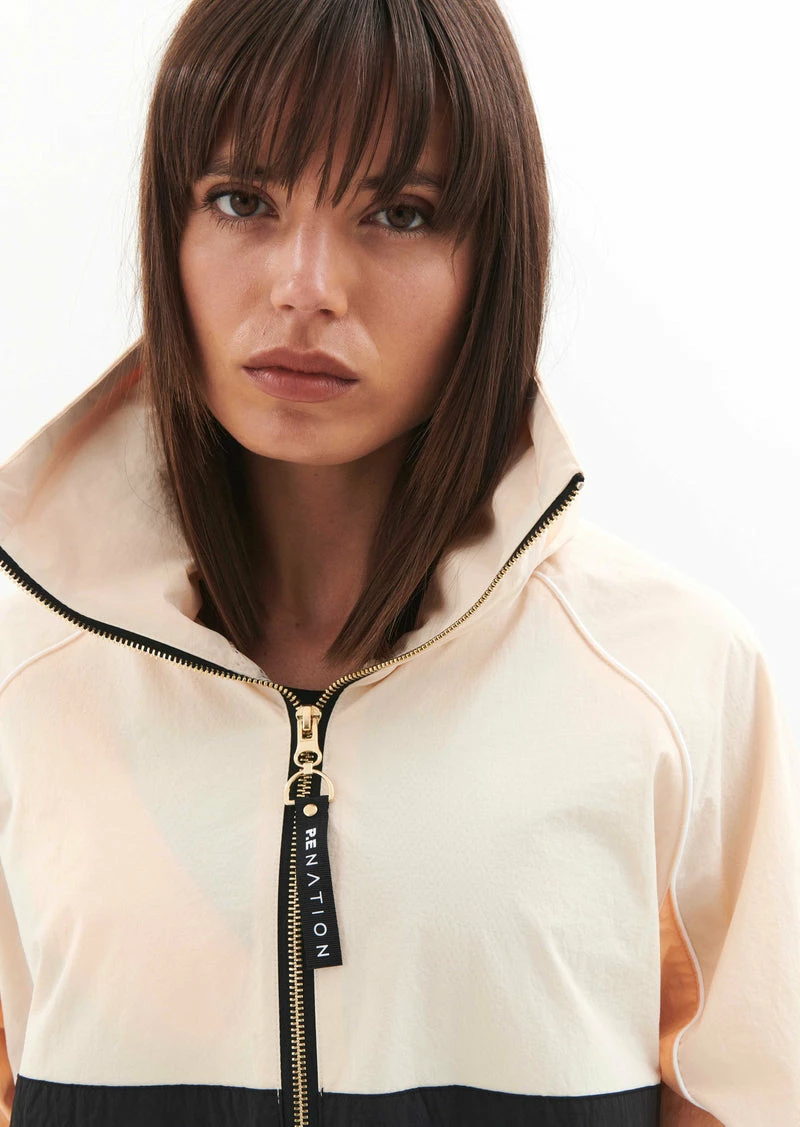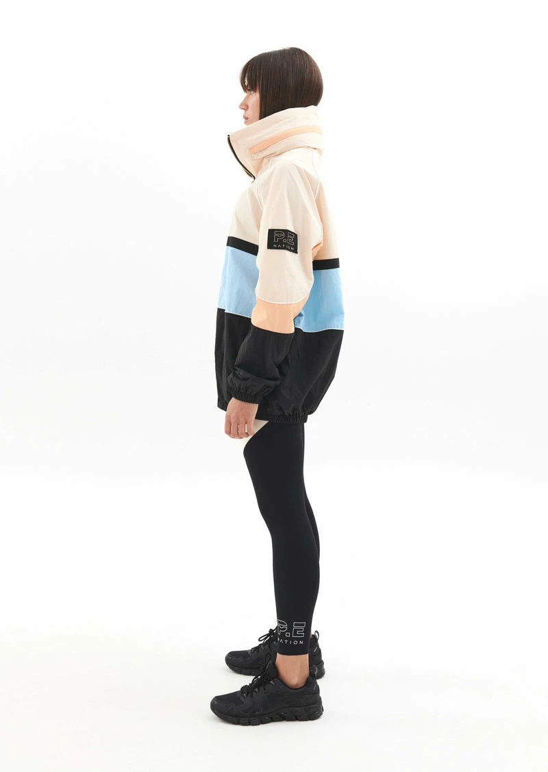 The Roll Shot Jacket in Pearled Ivory by PE Nation comes as part of the brands Ready, Set, Let’s Go Collection, designed to inspire sky high energy, the pursuit of all passions, an appreciation for the power of now and the endless possibilities hidden within present time. An oversized fit long-line jacket featuring contrast colour block panelling in Pearled Ivory, Black and Summer Sky, lightweight spray panelling and a mesh inner lining. The Roll Shot Jacket includes a concealed hood with a zipper to work with the elements. Featuring a signature gold P.E centre front zip closure and side pockets to hold all your essentials. Completed with a classic P.E Nation recycled woven logo patch on the sleeve.Â