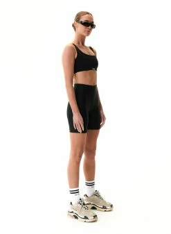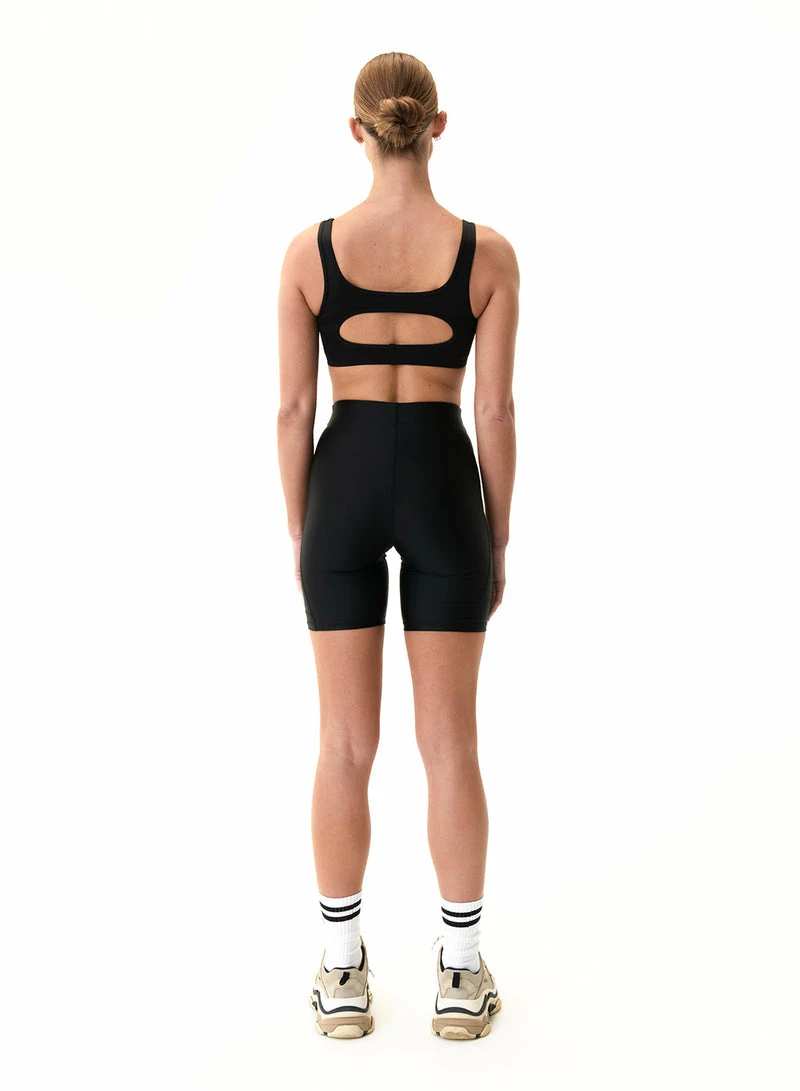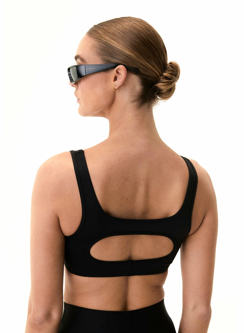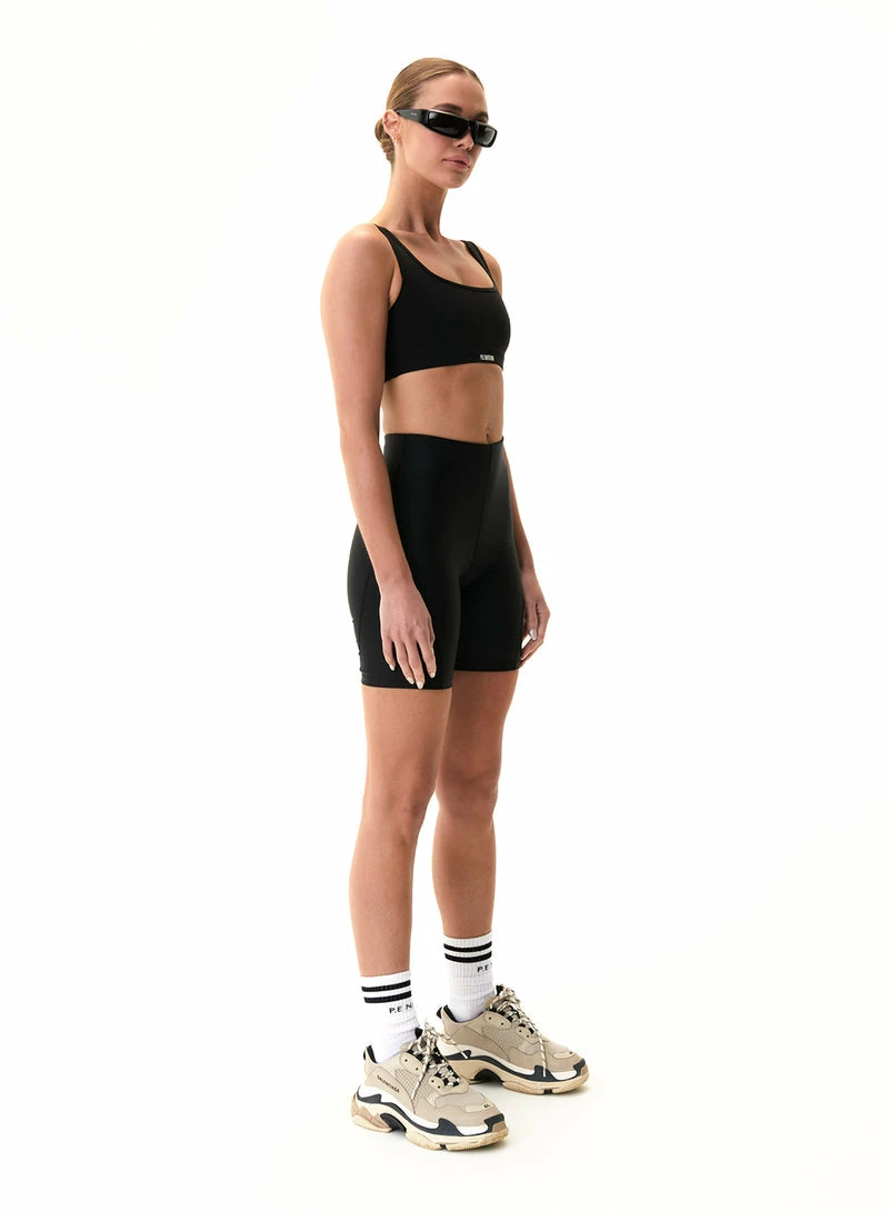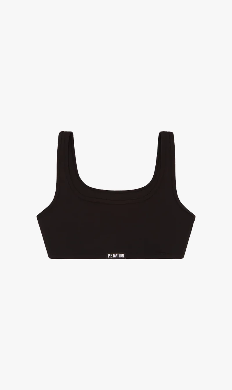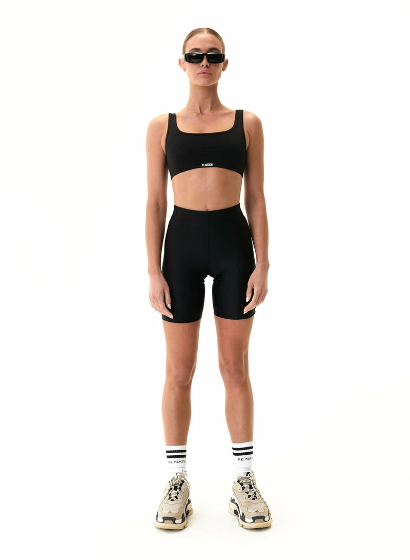 The P.E NATION Title Game Sports Bra in Black is an activewear must-have with a compressive feel, the Title Game is fit for cardio, running and gym training. Soft scuba-style fabrication with a matte look makes it ideal for all-day wear. Cut out detail features on the back panel, matched with the P.E Nation logo patch at the centre front.