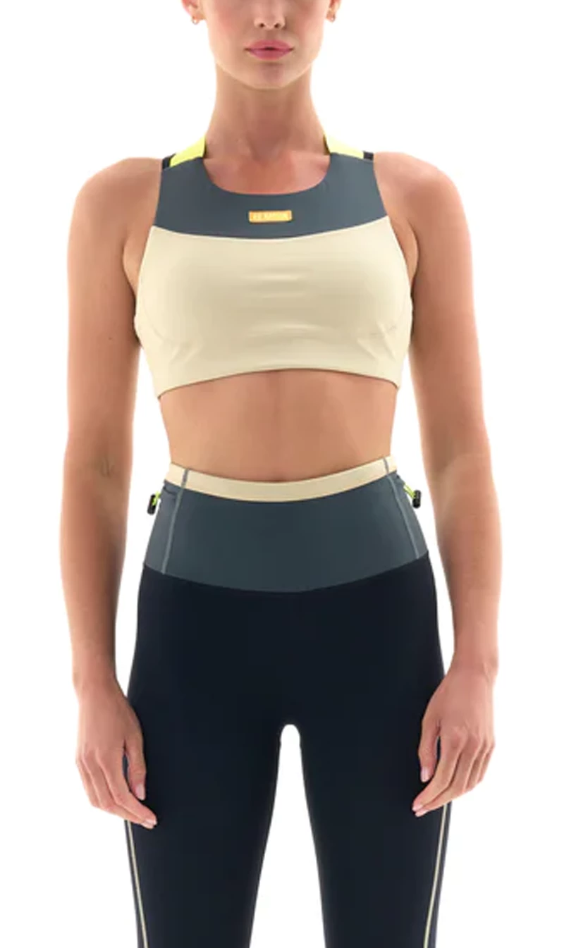 The P.E Nation Transmission Sports Bra in Charcoal will be your new gym buddy. Designed as a compressive active sports crop cut from 72% recycled fabric in a matte finish. The Transmission Running Sports Bra is a supportive, feel-good fit all around, leaving you feeling comfortable all workout long. Designed with a high neck at the front and double strap detail at back, featuring contrast colour block panelling at the front and P.E Nation branded elastic straps at back in knockout neon.
