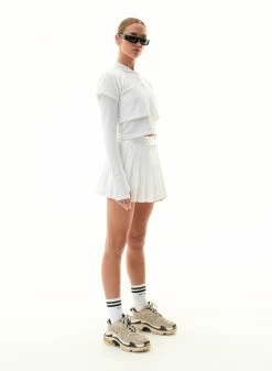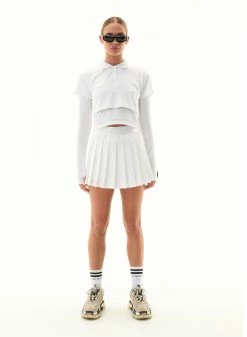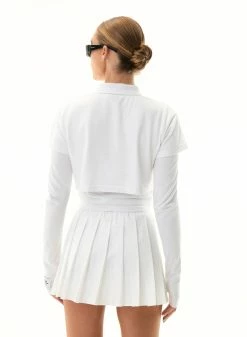 The P.E NATION Volley Ls Tee in Optic White is perfect for a retro-sport preppy look. Designed as a fitted long sleeve, the Volley has a double layer and a knitted shirt collar. With thumbhole openings on the sleeves, it adds extra comfort on and off the court. Crafted with cotton pique fabrication, the Volley Ls Tee is comfortable for warm-ups/cool-downs, on-court training, and all-day wear.