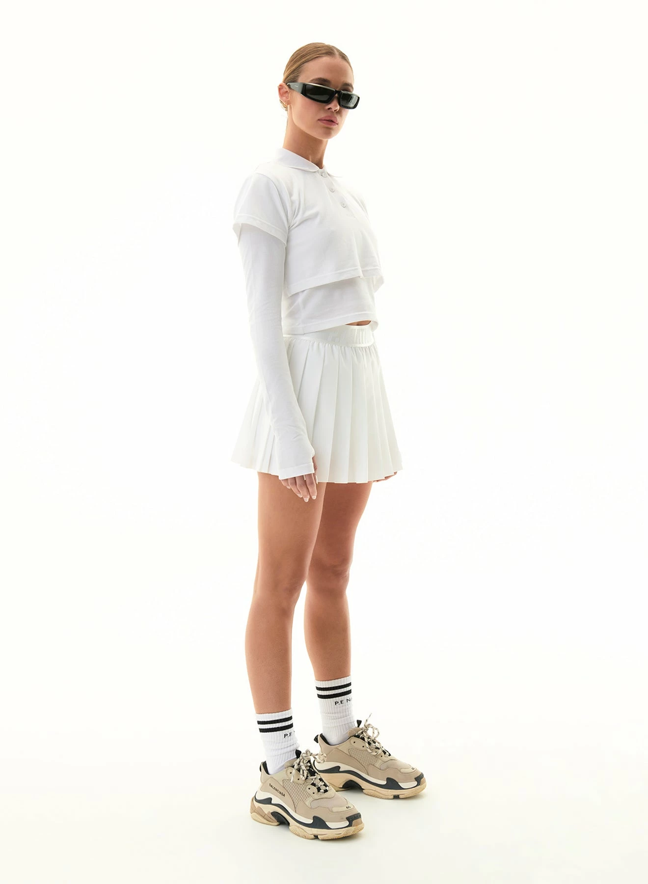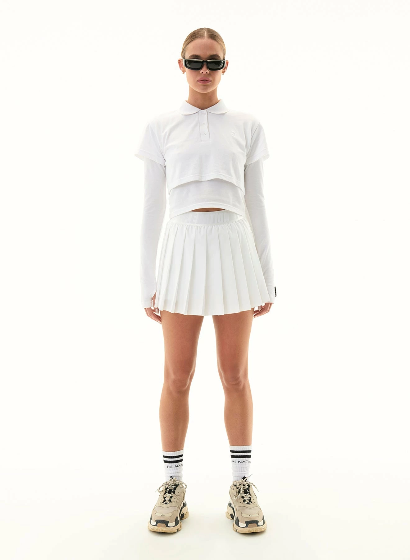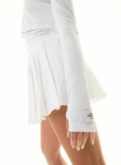 The P.E Nation Volley Skirt in Optic White is inspired by regulation tennis wear. Featuring a built-in bike short layer for comfort and side pockets, this pleated skort provides style on and off the court. Crafted with a spray fabrication of recycled materials, keeping the feel lightweight and moveable.Â