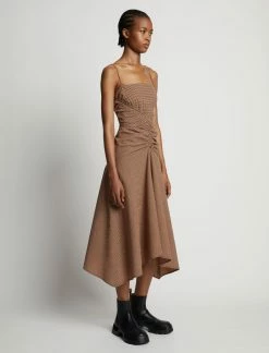 A go-anywhere style, the Proenza Schouler White Label Gingham Ruched Strappy Dress in coral and black is cut to an A-line silhouette and features ruching through the bust and waist. With an elegant square neck and slim shoulder straps, this asymmetric mid-length dress is truly a day to night piece. Just add a tailored blazer as the sun goes down.
