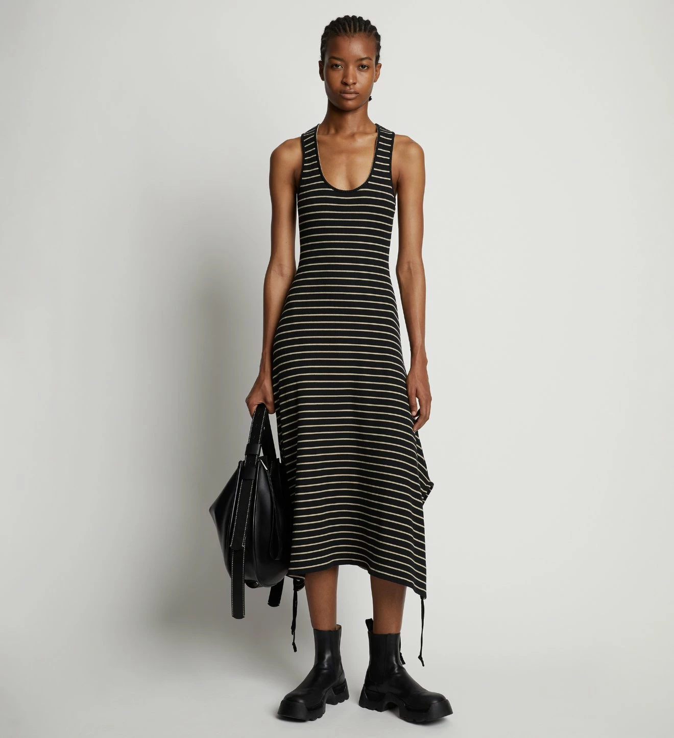 The Stripe Rib Sleeveless Dress by Proenza Schouler White Lable is a trans-seasonal essential, which can be effortlessly layered or worn independently. Cut from soft cotton this dress features contrast stripes in black and grey. With a ribbed-knit construction, scoop neck and asymmetric mid-length hem with self-tie drawstrings, pair this beautiful dress with a simple slide, or Proenza’s signature Chelsea boot.Â