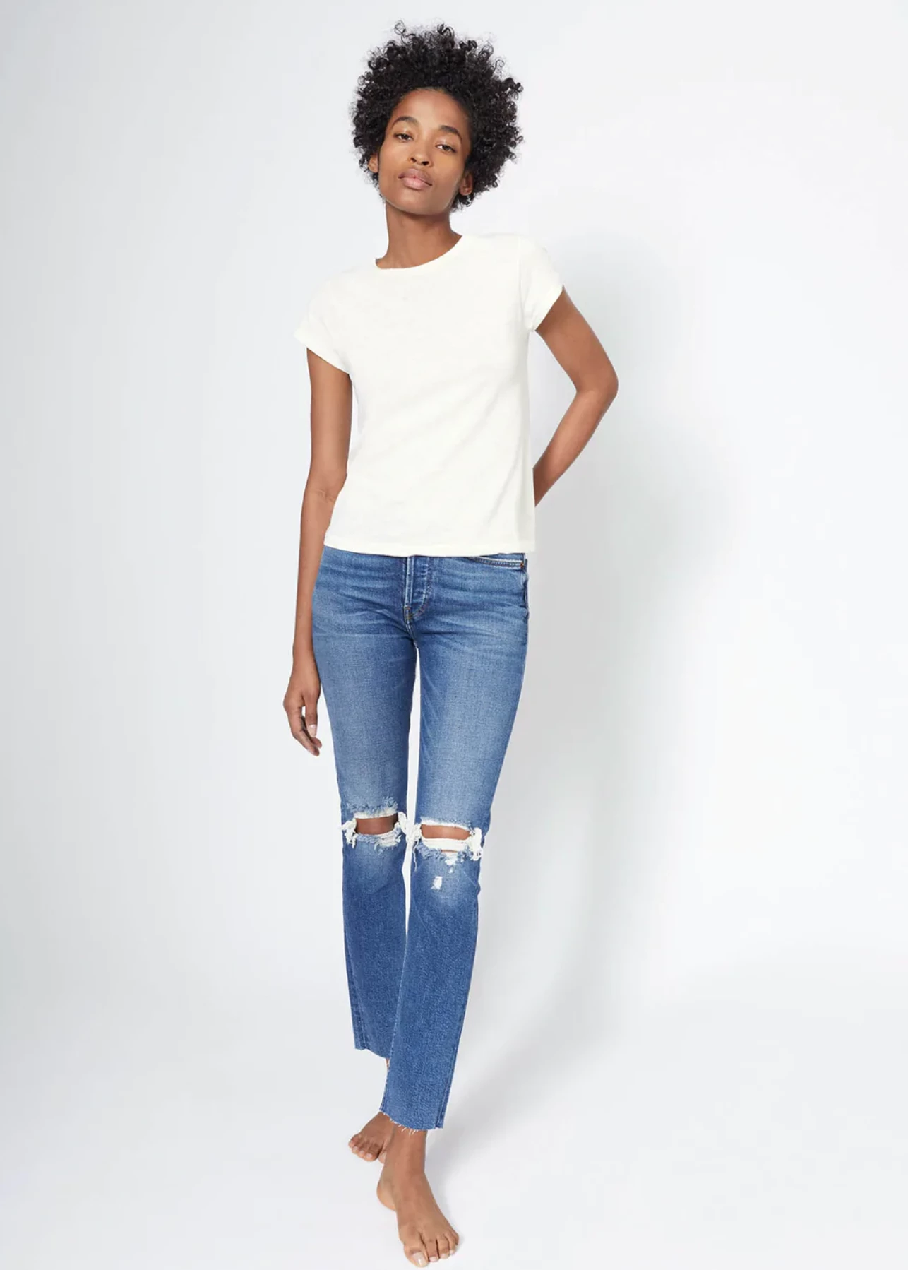 The RE/DONE 60s Slim Tee is a classic crew neck tee with a slim body that has the look of a vintage tee shirt that has been washed and worn hundreds of times. The 60s Slim tee shirts are made of 100% combed cotton, developed exclusively by RE/DONE, knitted, and sewn entirely in the USA.
