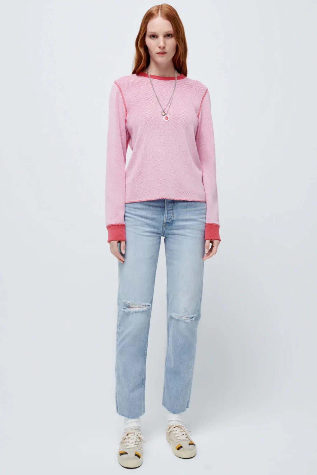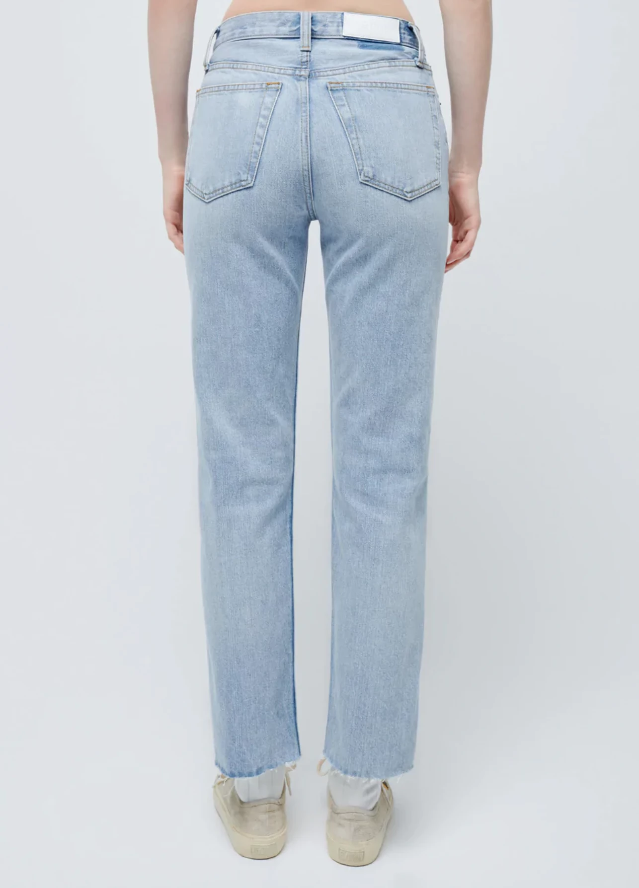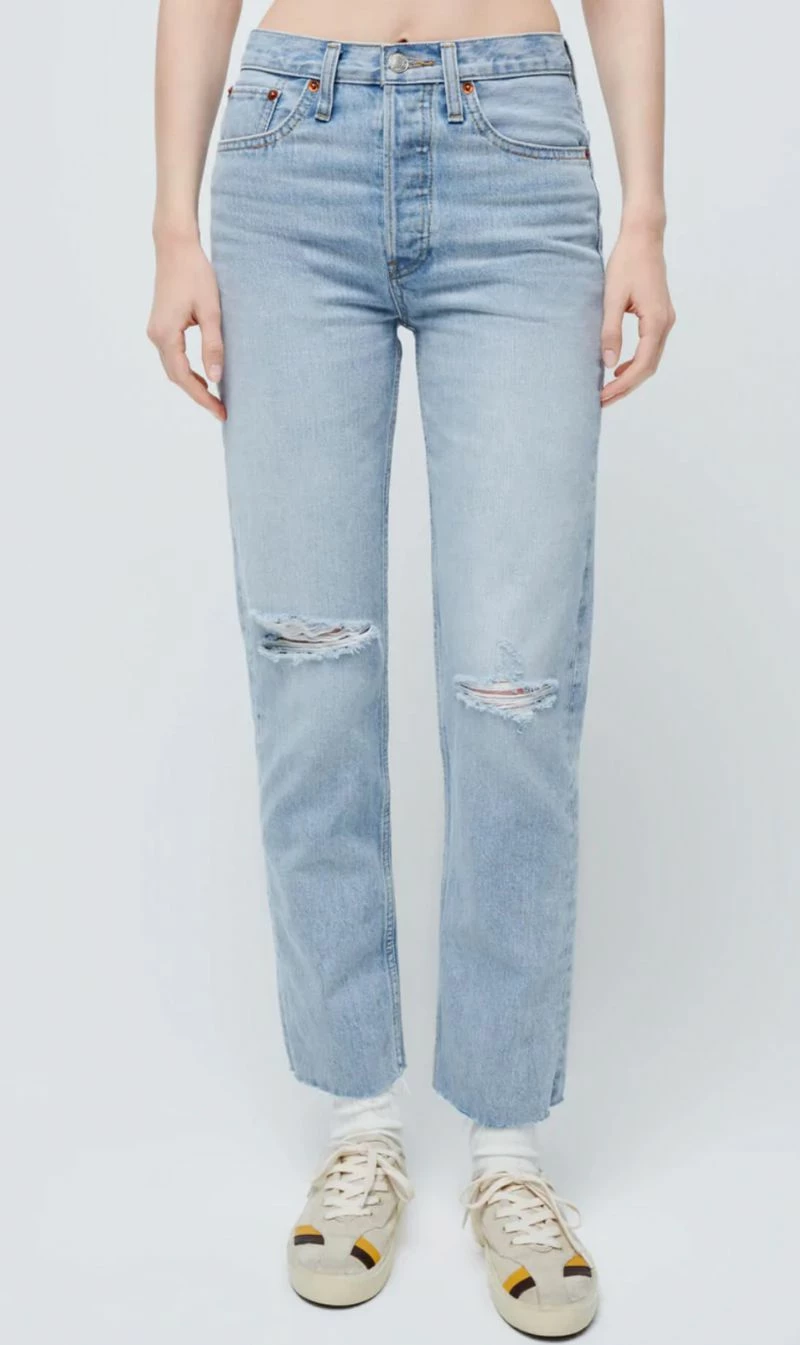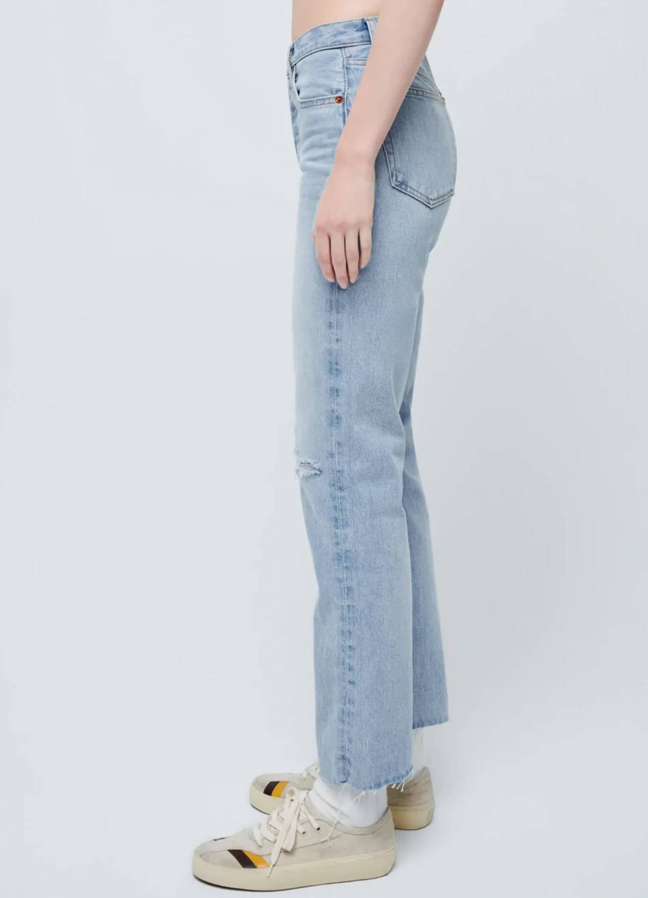 The 70s Stove Pipe in Surf Blue Destroyed by RE/DONE is the brand’s version of the classic 70s-inspired straight leg jean with a cropped inseam. With a beautiful light whiskered faded wash reminiscent of the decade in rigid denim, a classic button fly, and a cut-off hem.