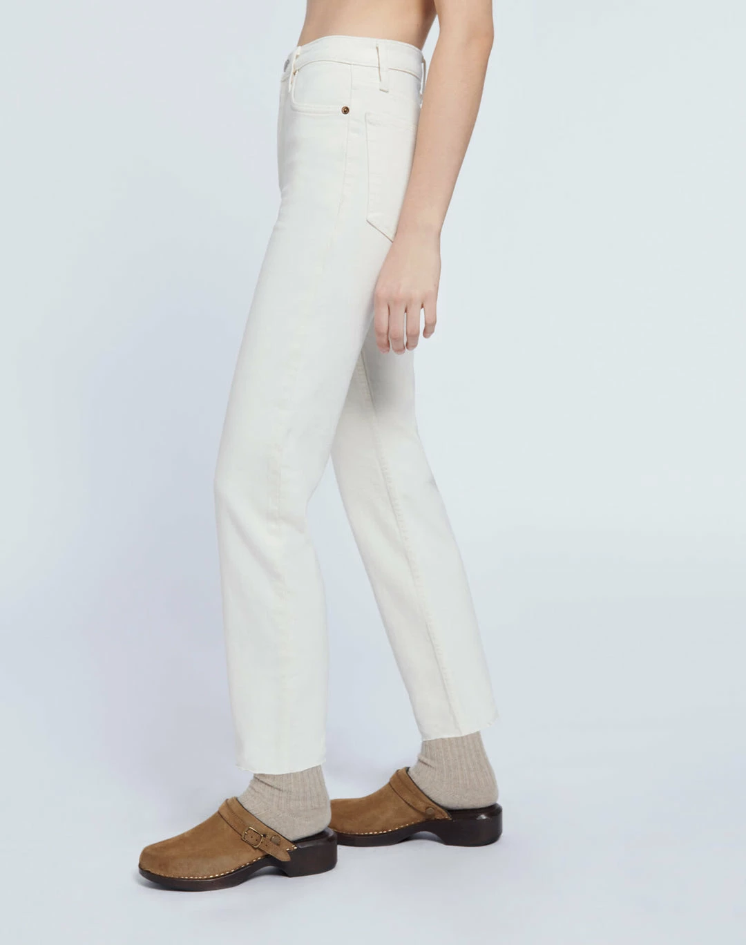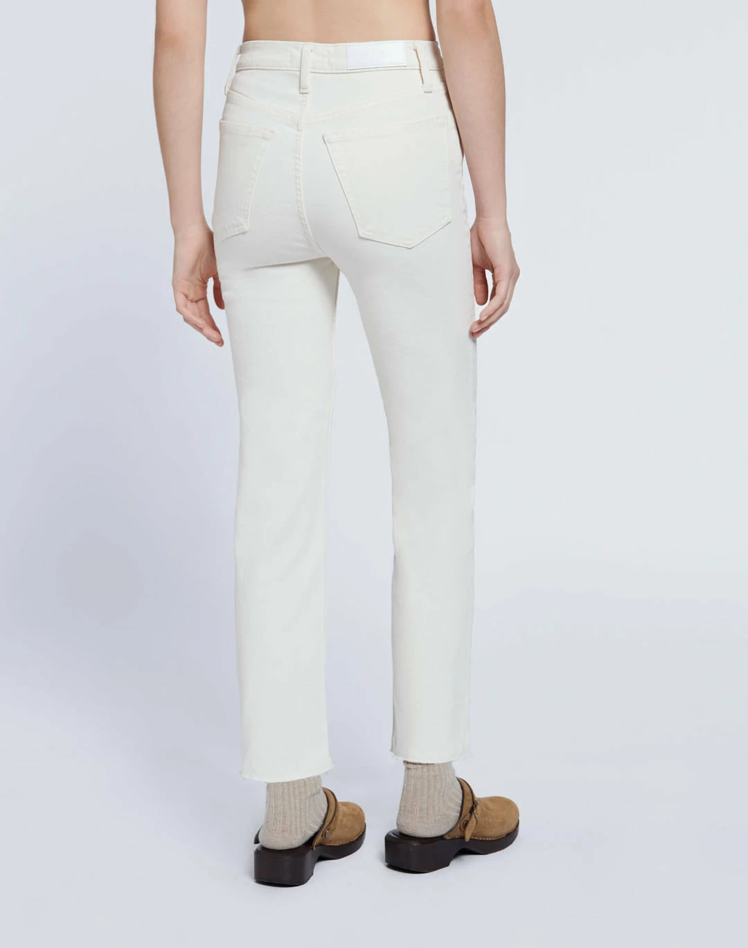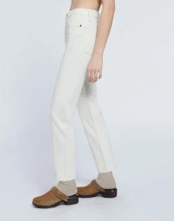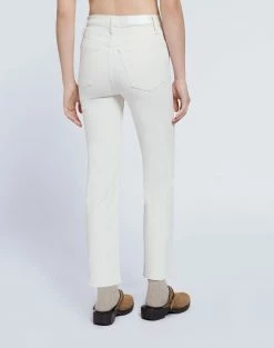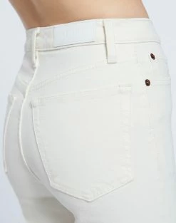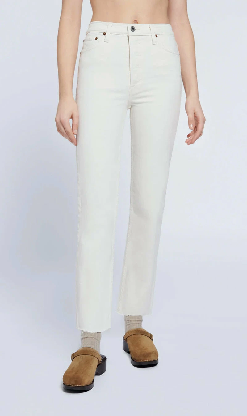 The RE/DONE 70s Comfort Stretch High Rise Stove Pipe in Vintage White is a version of the classic 70s-inspired straight leg jean, meant to show a bit of ankle or seamlessly compliment high top shoes. Features a creamy natural vintage-inspired wash in comfort stretch denim, a classic button fly, and a raw hem.