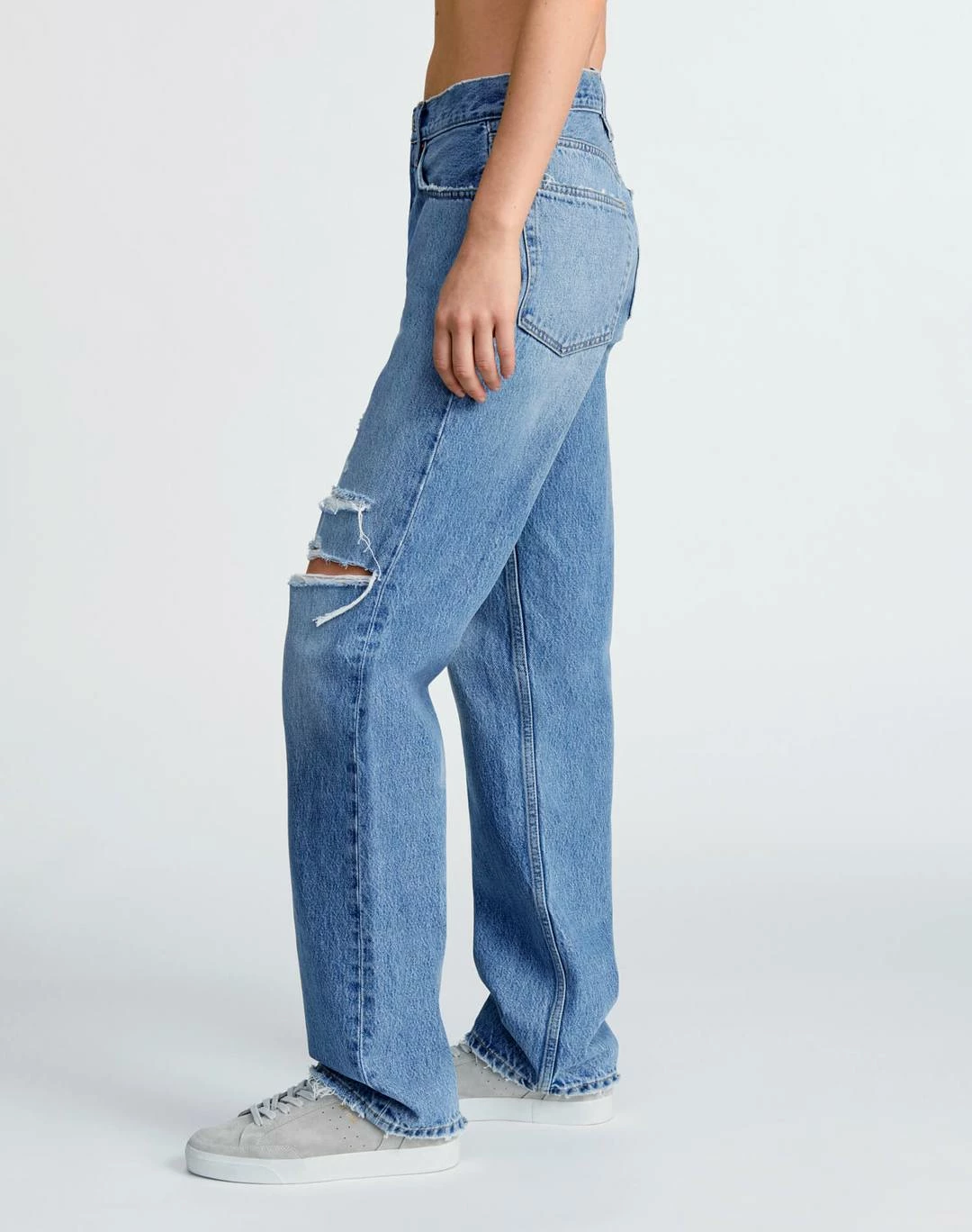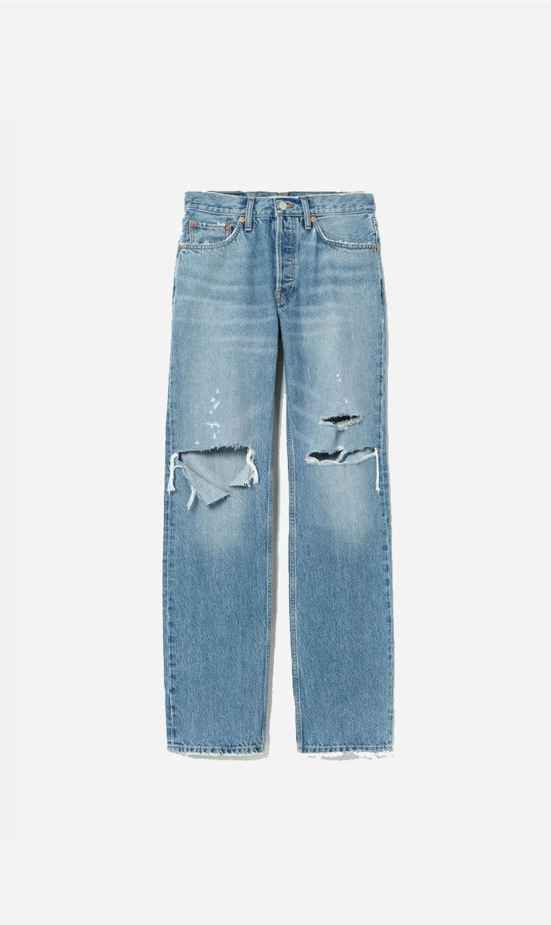 The RE/DONE 90s Comfy Jean in Chilled Indigo is their take on the easy-fitting boyfriend jean from the 1990s. Featuring a destroyed light wash with a busted knee hole, a classic button fly in rigid denim; these jeans are instant classics, with their slouchy relaxed silohuette.