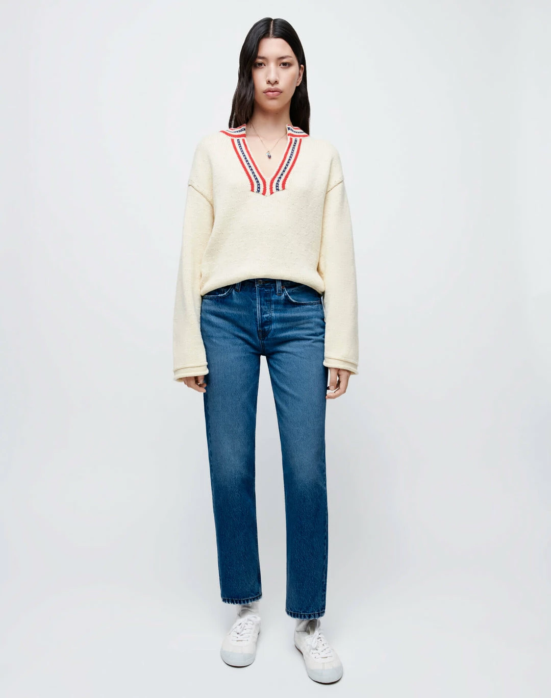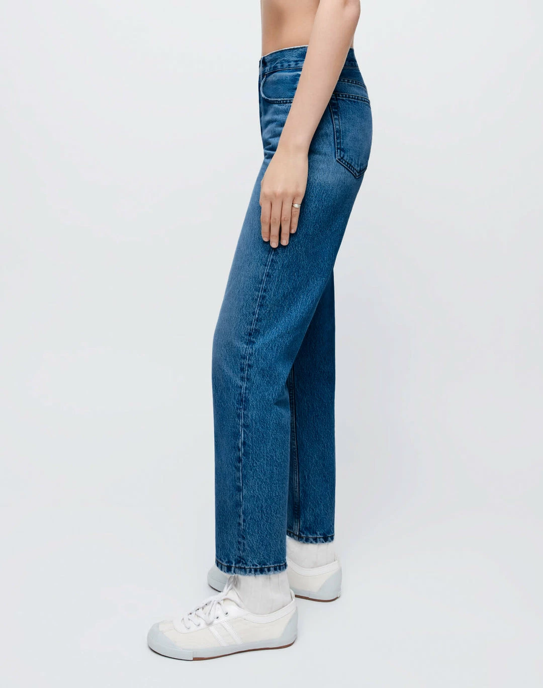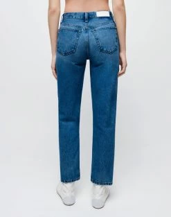 - Mid rise fit sitting above the hip bones and hitting at the ankle bone. Slim-fitted through the thigh with a straight leg down to your ankle.