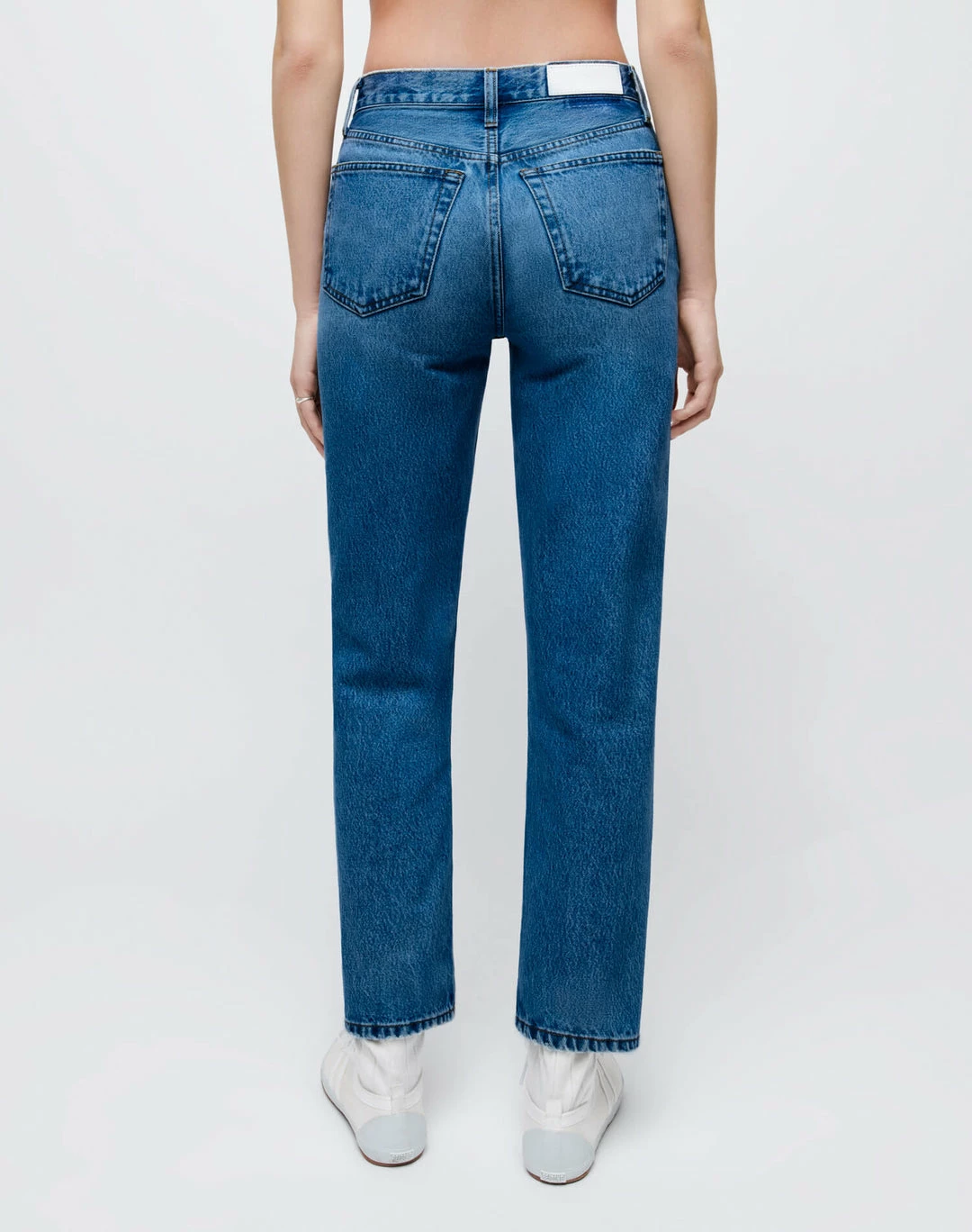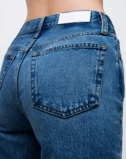 The RE/DONE 70s Mid Rise Stove Pipe in Royal Fade is a version of the classic 70s-inspired straight leg jean with cropped inseam. With a whiskered medium indigo wash in extra stretch denim, a classic zipper fly, and a finished hem.