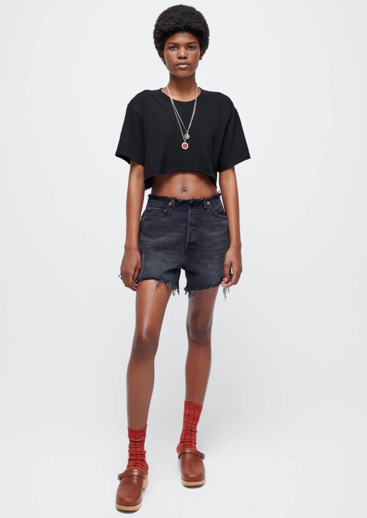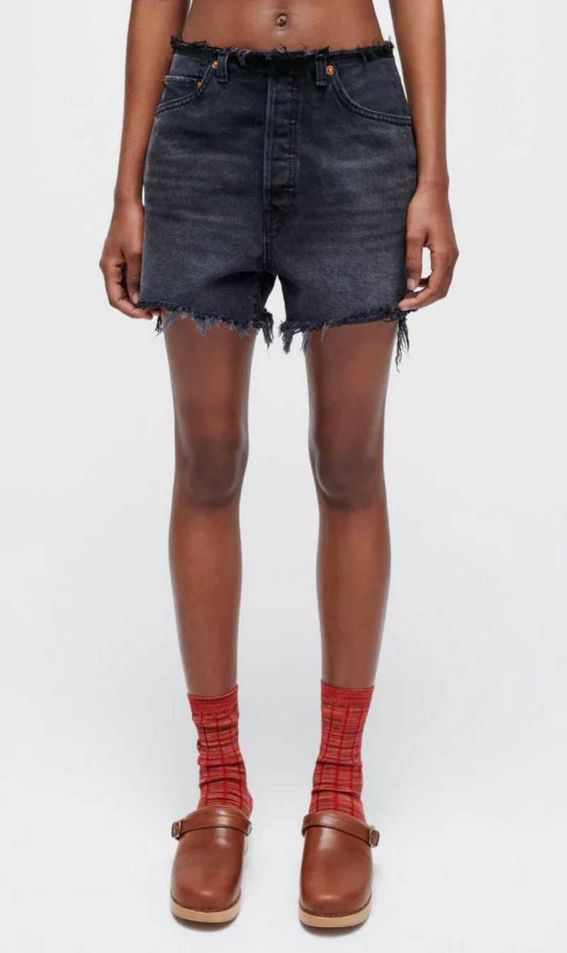 The Raw Waist Cutoff Short in Black is RE/DONE’s update to their 50s Cutoff silhouette, this time with a lower, raw waist. Featuring cutoff details at the hem and waist, a slim fit throughout, and a button fly. Style with a white tee and slides this summer.