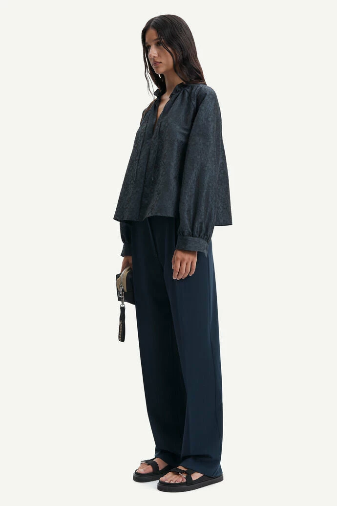 The Samsoe Samsoe Karookhi Blouse in Salute is a relaxed-fitting blouse that will elevate your look. Tie-fastening front neck opening with a gathered neckline and a frilled collar. Recycled polyester blend fabric with a tonal textured jacquard pattern. This product is GRS certified. Each stage of Samsoe Samsoe’s supply chain has met strict social, environmental, and chemical requirements.