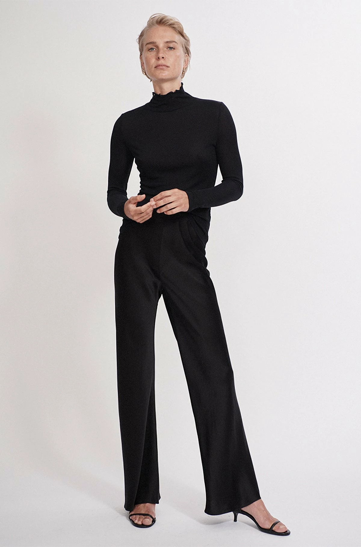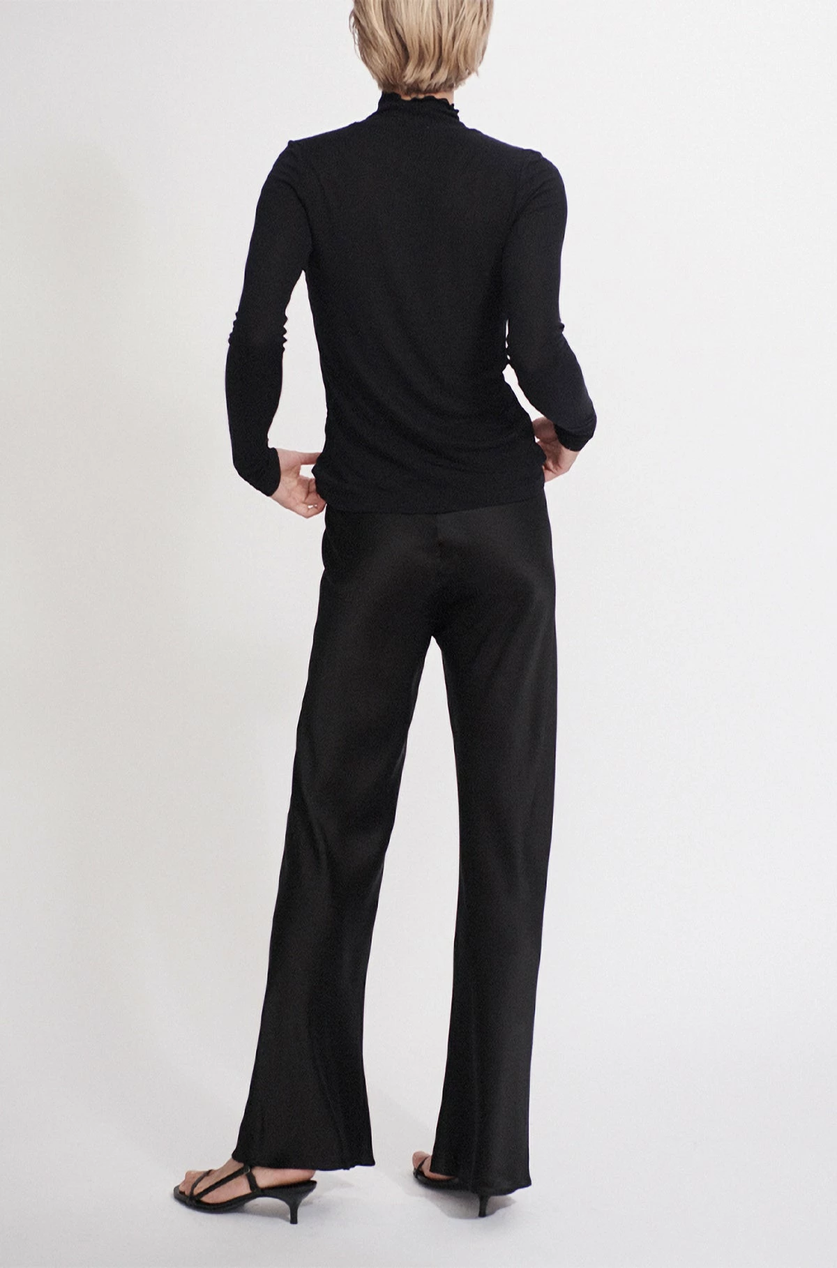 The Silk Laundry Ribbed Turtleneck in Black. An essential Silk Laundry style with a soft neckline that is impossibly comfortable and especially soft. Made from a ribbed silk that has been finely woven to create the perfect, barely-there texture.