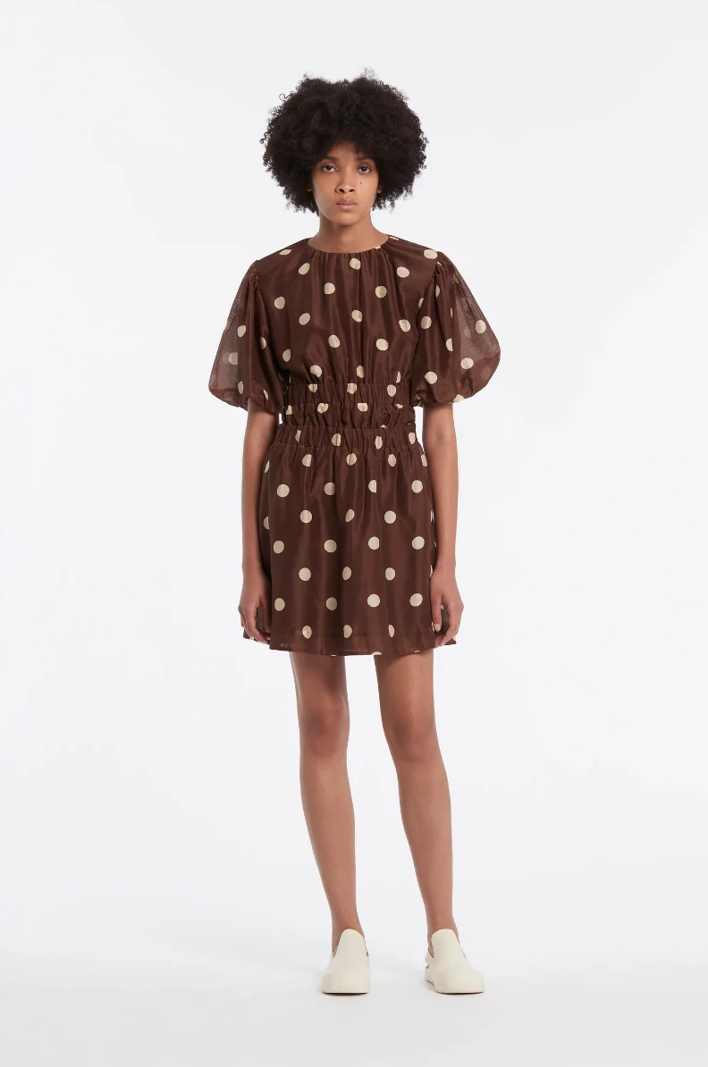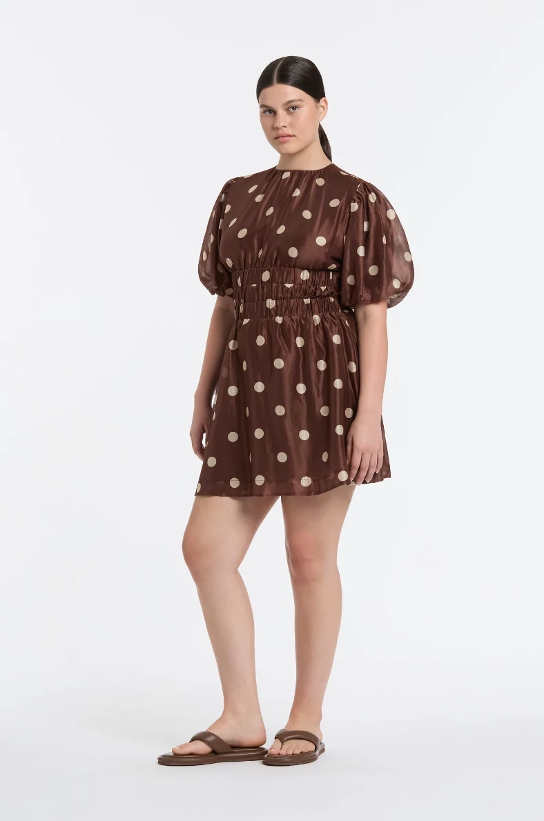 The Vivi open-back mini dress is a classic SIR piece. With a feminine and playful silhouette, this mini is crafted in a lightweight silk/cotton in a polka dot print and features exaggerated puff sleeves, an elasticated waistband and open back tie detail. Pair with a sneak by day, or a strappy sandal but night.Â
