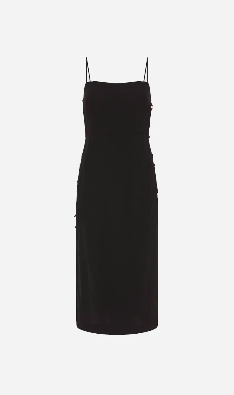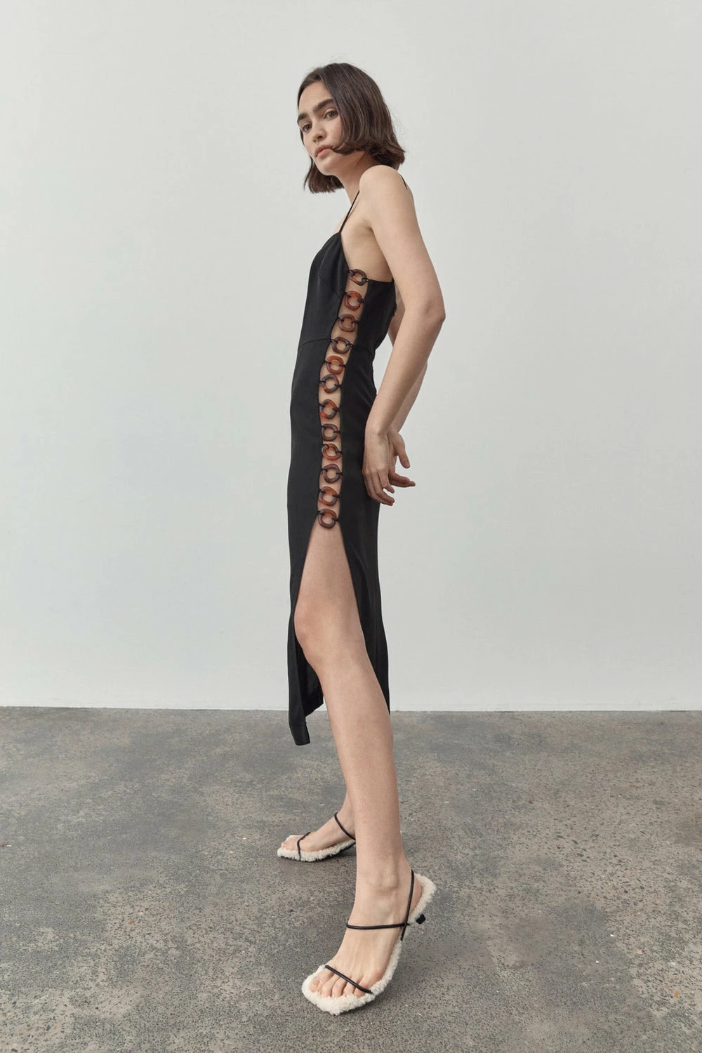 The Link Detail Dress by St Agni is a statement style with unexpected elements. Constructed from a breathable mid-weight Viscose, this midi length silhouette features a straight neckline, slim straps and open tortoiseshell rings that cascade the ribcage. Pair with a strappy heel for a true 90’s look.