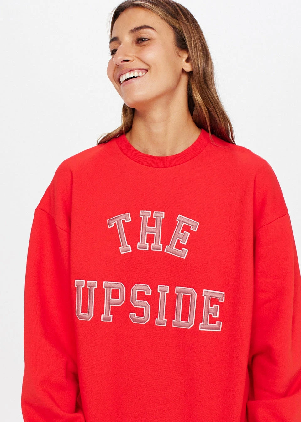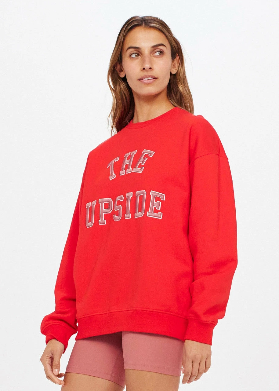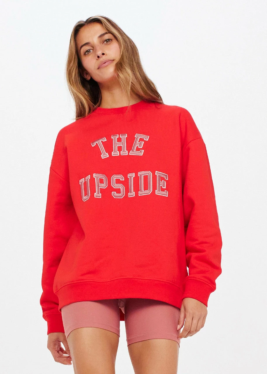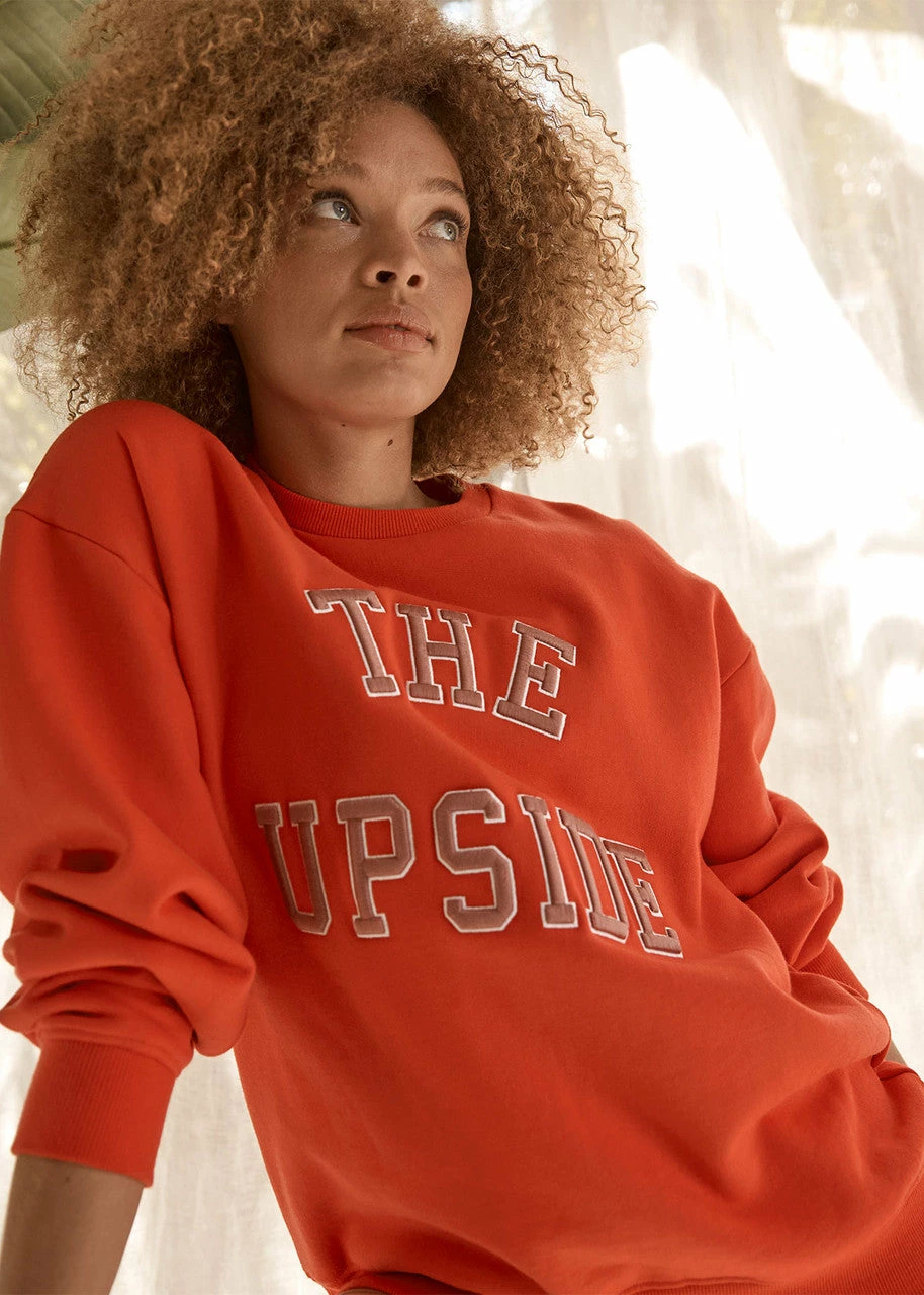 The ultimate in uplifting activewear, the Saturn Crew in Chilli by The Upside is fun and versatile. Cut with a relaxed fit, this sweater is sustainably minded and crafted from organic cotton. With collegiate Upside branding, pair this with your day-to-day activewear, or denim shorts for a casual vibe.